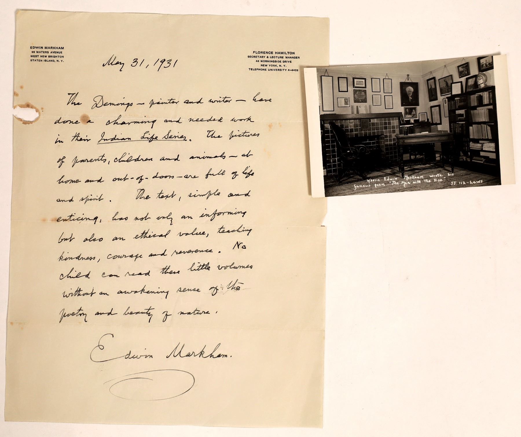 This is a personal letter written on May 31, 1931 by poet Edwin Markham about the authors Demming on their book "Indian Life Series". Markham is noted for his poem "The Man With The Hoe" written in 1898 symbolizing man's labor but receiving little reward or rest. Original copy; light foxing, tears in folds, and spotting. The lot includes an RPC of the Markham personal library or office.
