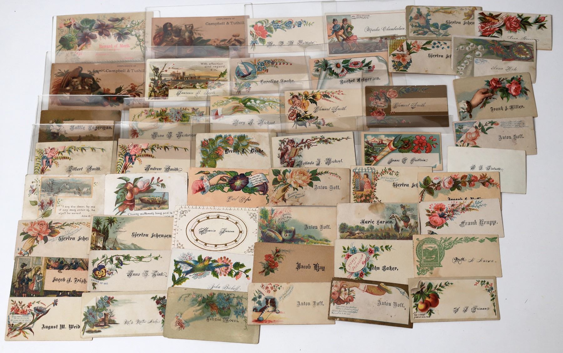 Group of about 49 personal trade cards, c. late 19th century. These are all trade cards with the name of one or two individuals on them. Nice, decorative designs, mostly of flowers. Various sizes, largest is about 4.25 x 2.75 inches. Good condition.