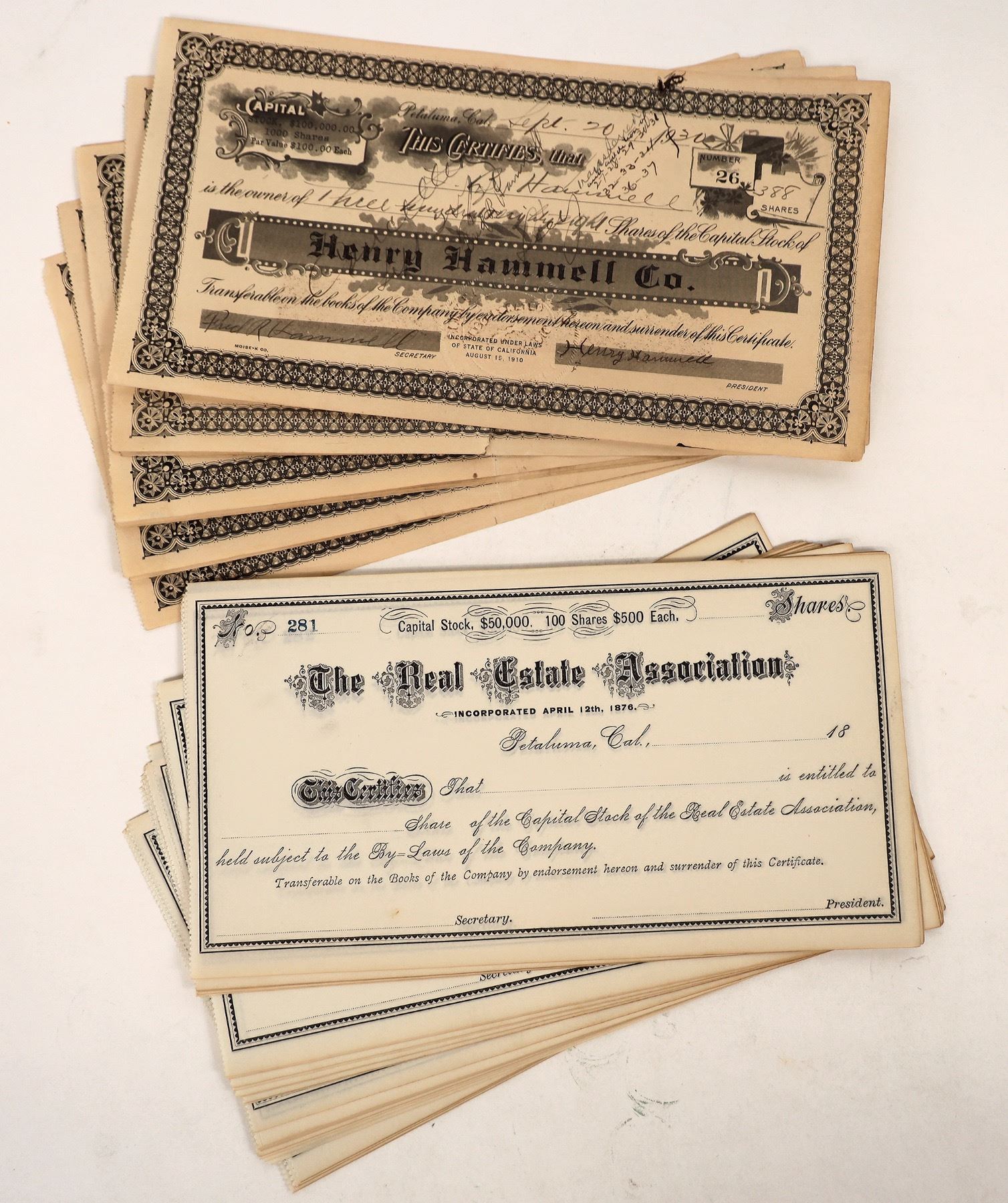 Too many to count stock certificates from two Petaluma California entities. They include several blank certs issued by The Real Estate Association, dated April 15, 1876. The other are several issued and cancelled stock certificates issued by Henry Hammell Company. There are several dates from early 1900s to the 1930s. Please see photos for more details.