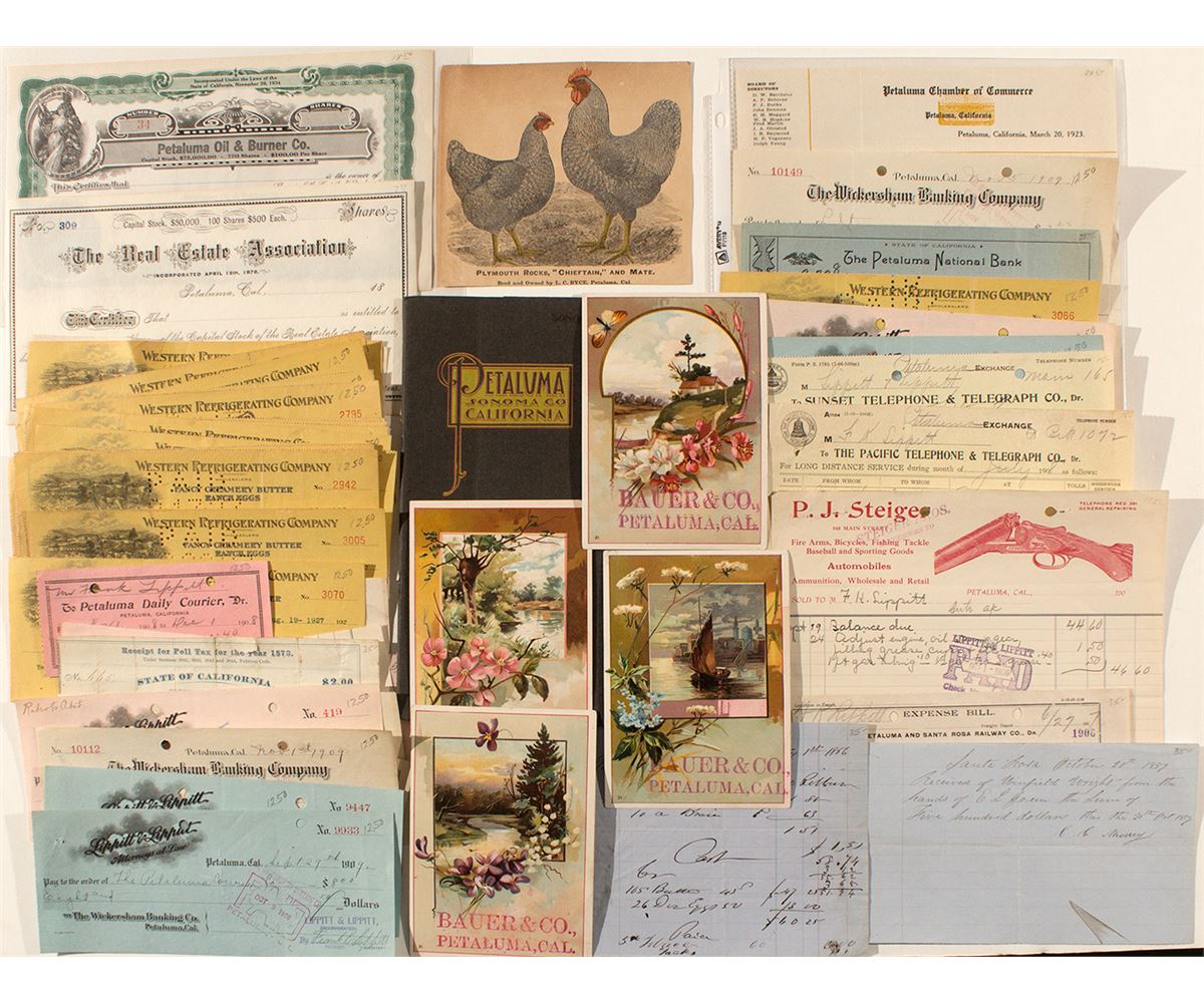 60 items. Checks (50 or so), stock certificates (The Real Estate Assoc. 18-- and Petaluma Oil & Burner Co.), and other documents from Petaluma, including early pieces. Highlights include a pictorial billhead for P.J. Steiger Fire Arms Dealer, 1856 (Petaluma) and 1859 (Santa Rosa) handwritten reciepts, four different illusttrated trade cards for Bauer & Co., a 24 page tourism booklet with map (1906), and many pictorial checks for Western Refrigeration Co. (Prag Collection)