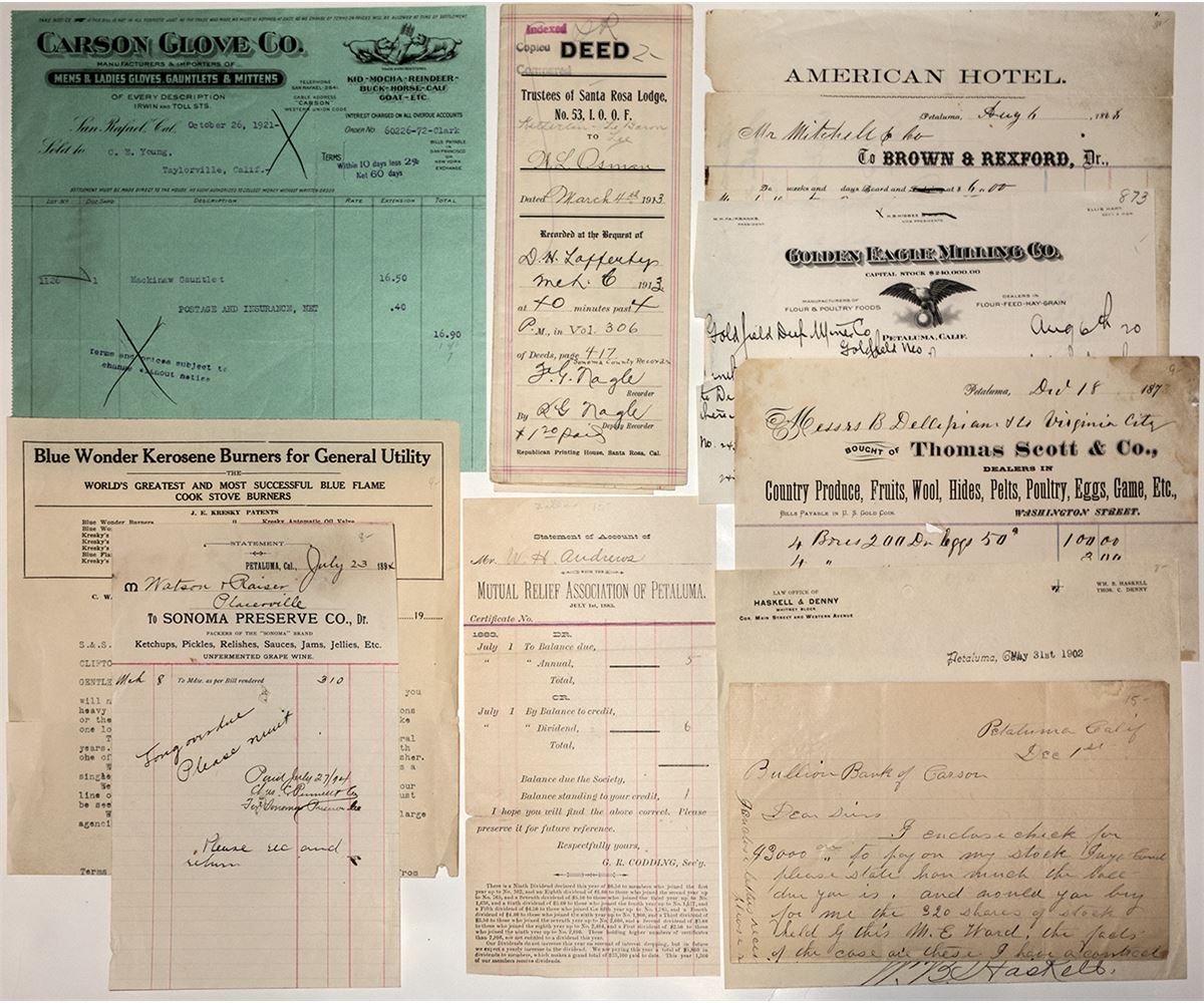 Eleven pieces of Northern California history: 1913 deed from Santa Rosa, receipts from Petaluma businesses.