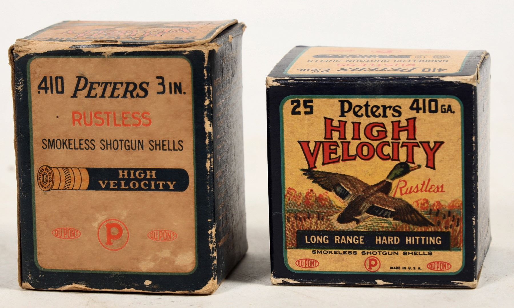 This lot holds two boxes of Peters .410 ga. vintage shotgun shells. One box is 2.5 in. X 6 shot and the second box is 3. in. X 71/2s. Boxes are full with 25 rounds each. In excellent condition. No sales to Connecticut, California, New Jersey, Illinois, Hawaii, New York, and Massachusetts. No international sales. Extra shipping charges apply. This ammunition is for collecting purposes only. Please see photos for details.