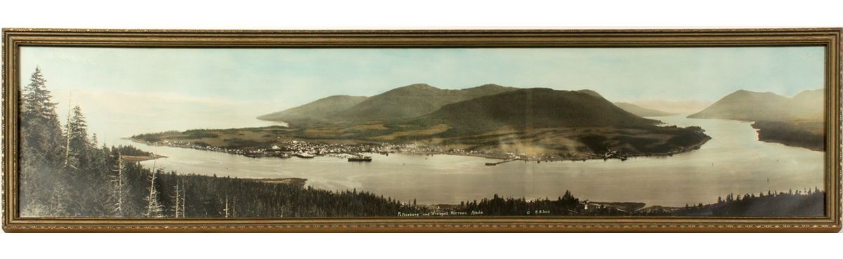 Hand-tinted panoramic photograph of Petersburg and Wrangell Narrows, Alaska by H. A. (Heath Arlo) Ives. Original frame—11" H x 45" W.