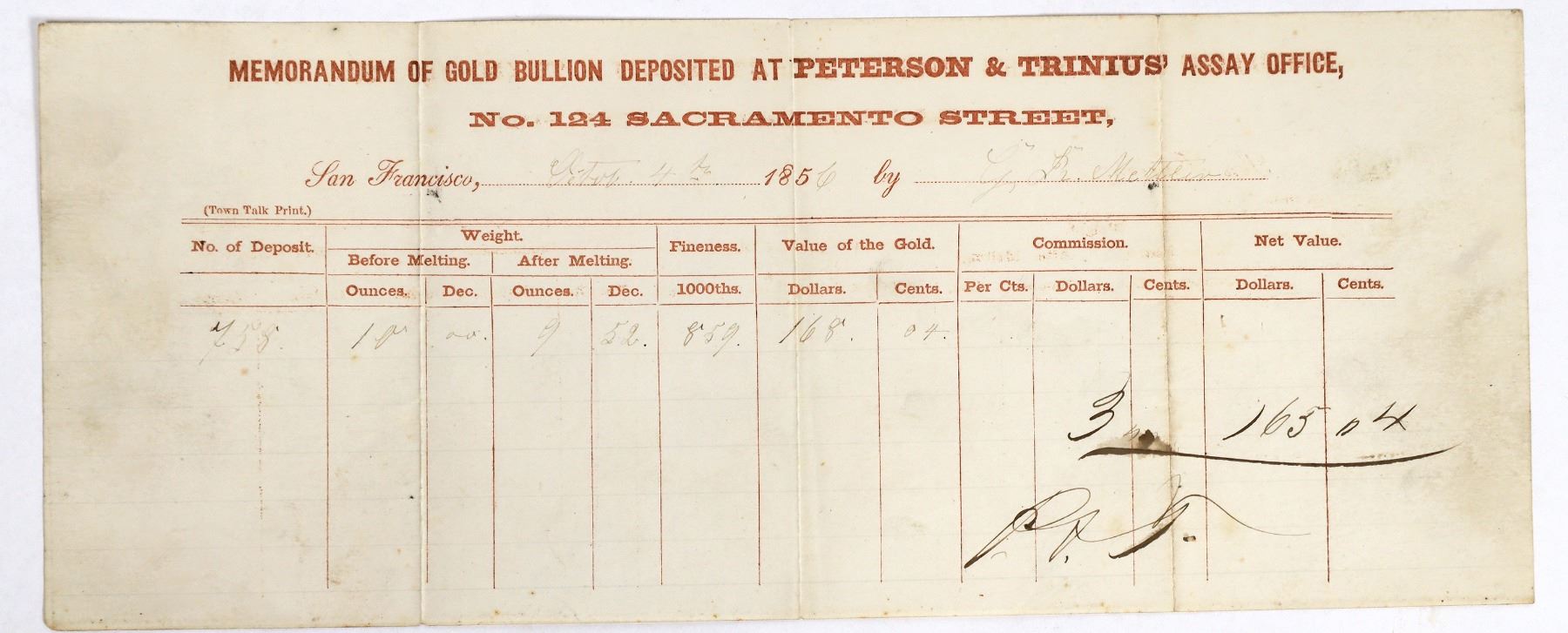 Extremely rare. Memorandum of Gold Bullion Deposited at Peterson & Trinius' Assay Office, No. 124 Sacramento Street. Dateline San Francisco, October 4th, 1856. Deposit by GF Meltlin. After melting, 9.52 ounces, .859 fineness. Signed P&T. Red print on creme paper. 4.25 x 10.5" Deep folds, some soiling. We were not able to locate much about this Gold Rush assay firm. We did find mention in May 1857 (Daily Alta California) that the firm consisted of Chas. M. Peterson and Chas. Trinius and that they had dissolved the partnership. This particular item was sold in The Rush for Gold Summer Auction 2008. We cannot find any other sales of these receipts. Perhaps unique. San Francisco California Franklin Collection