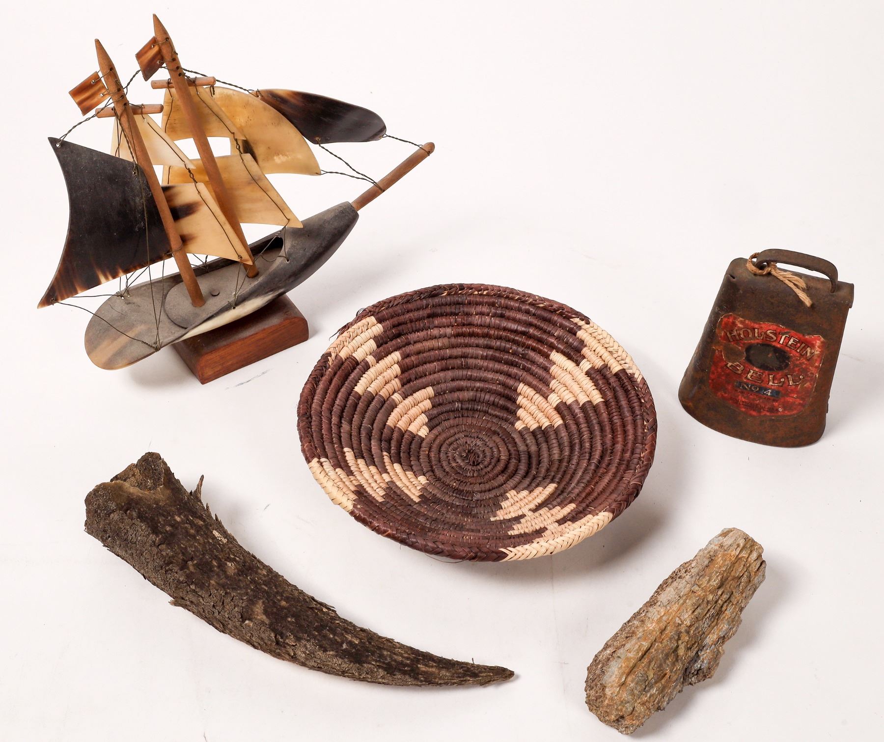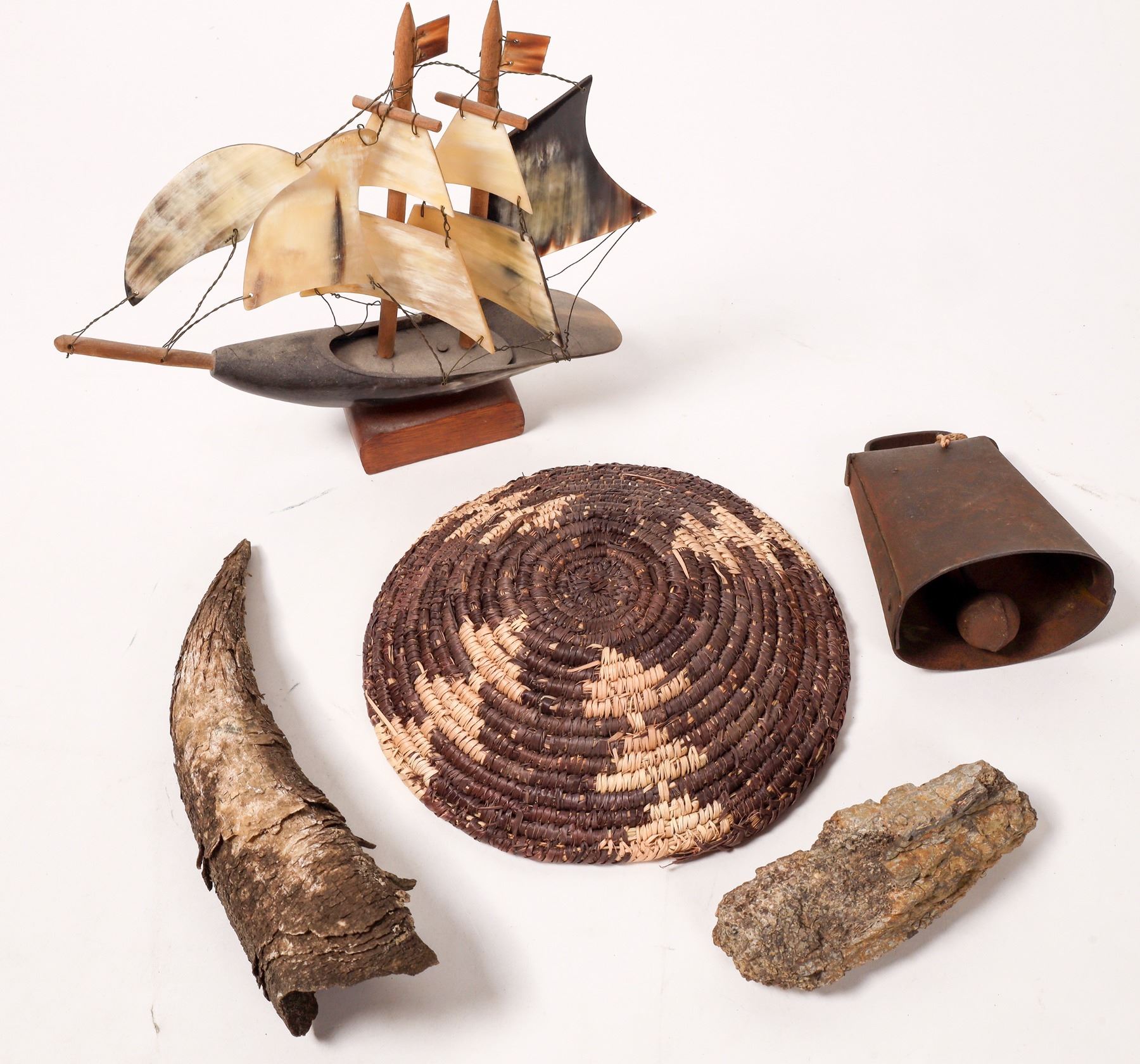 Unusual sailboat model made from horn 8.5x10". Petrified wood 5x2", African basket 7.75", metal Holstein bell 4.75", animal horn 9". Gary Bracken Collection