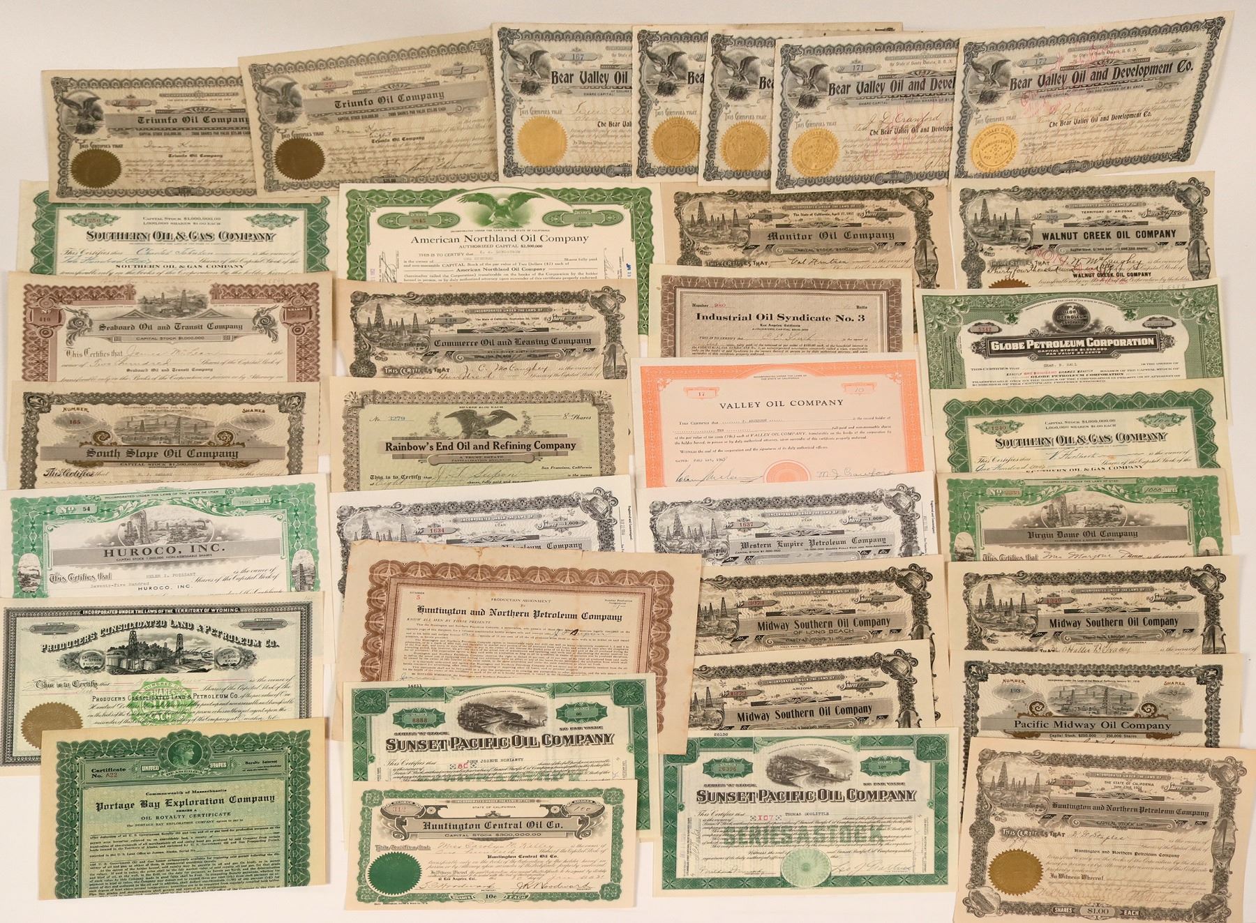 Lot of nineteen. Stocks with oil field vignettes include South Slope Oil, Seaboard Oil and Transit, Walnut Creek Oil, Commerce Oil, Monitor Oil (# 22). Also Rainbow's End Oil and Refining, Industrial Oil Syndicate No. #3, Globe Petroleum Corporation, 2 Southern Oil & Gas, American Northland Oil, 2 Triunfo Oil, 5 Bear Valley Oil and Development. Also a Number 17 Valley Oil Company. Western Empire Petroleum. # 1637. Oil field vignette. 1958. 2) Western Empire Petroleum. # 1634. Oil field vignette. 1958. 3) Virgin Dome Oil Company. 1924. # 2233. Oil field vignette. 4) Huroco, Inc. 1961. Number 54. Oil field Vignette. Condition ranges from nice to extremely nice. Mostly from the Huntington, Sunset, Midway area. Stocks with oilfield vignettes include Huntington and Northern Petroleum and 3 Midway Southern (also underprint oilfield vignette). 2 Sunset Pacific Oil stocks with oilfield and processing plant on the ocean. Pacific Midway has an oilfield vignette and is very striking with brown scroll work. Also Huntington Central Oil. Finally a NUMBER 5 for the Huntington and Northern Petroleum Company in 1923. Beautiful oil stock certificate issued in 1889. Incorporated in Wyoming Territory. Oil derricks, tanks and barrels. Cert. #484. Portage Bay Exploration Company Oil Royalty Certificate Series A, Certificate A22, Series A, signed Howard Rice, president.