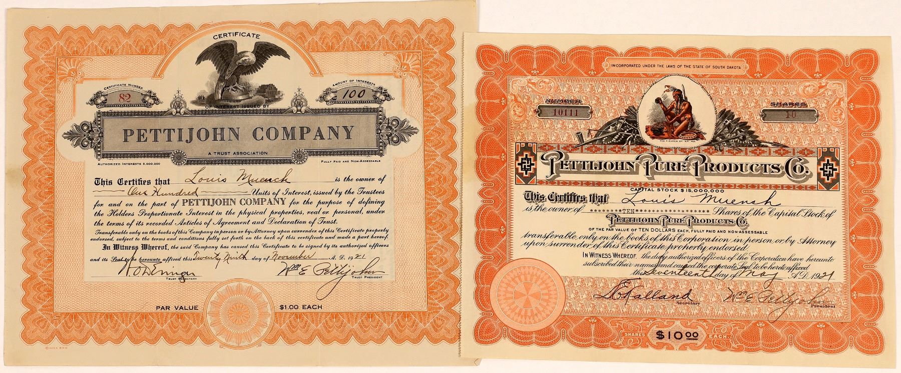 Two stock certificates, one No. 10111 for 10 shares of Pettijohn Pure Products Co., with great vignette of a Native American with the slogan underneath "The Pioneer of 'Em All," and the other No. 82 for 100 shares of the Pettijohn Company, both issued to Louis Muench in 1921, both signed by the companys' President William E. Pettijohn, and the Secretaries. Pettijohn Pure Products Co. was a very early cereal company based in Minneapolis, Minnesota, which claimed to have formulated its products from American Indian sources. Pettijohn, whose mother was half Mdewakanton Dakota, initially was a successful breakfast-food manufacturer in California. After being swindled, forced to sell his company at a great loss, in 1900 he staged a comeback, announcing his return to the industry. Condition is very fine with light folds, and very light wear.