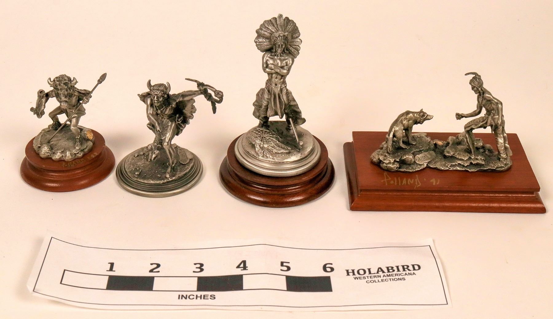 Four miniature statues of Native Americans in different costumes and scenes, presented by Chilmark Fine Pewter. The artist, Donald Polland, is known for the intricate detail of his work. The lot includes: "Uneasy Truce," an Indian giving a wolf some food, autographed in gold by Polland, 1991, Special Event Edition, with wooden base, No. 308, 3.5" tall, base is 5" x 3"; "Sioux War Chief, full headdress with dream catcher and peace pipe, 1981 limited edition 986/2500, 4.75" tall, base is 3.25" round; "Buffalo Dancer," wearing buffalo head with spear, autographed in gold by Polland, 1991, 3.25" tall, base is 2.5" round; and "Mystic Medicine Man," wearing animal skin and horns, 1995, No. 860, no base, 3.5" tall x 3.75" wide.