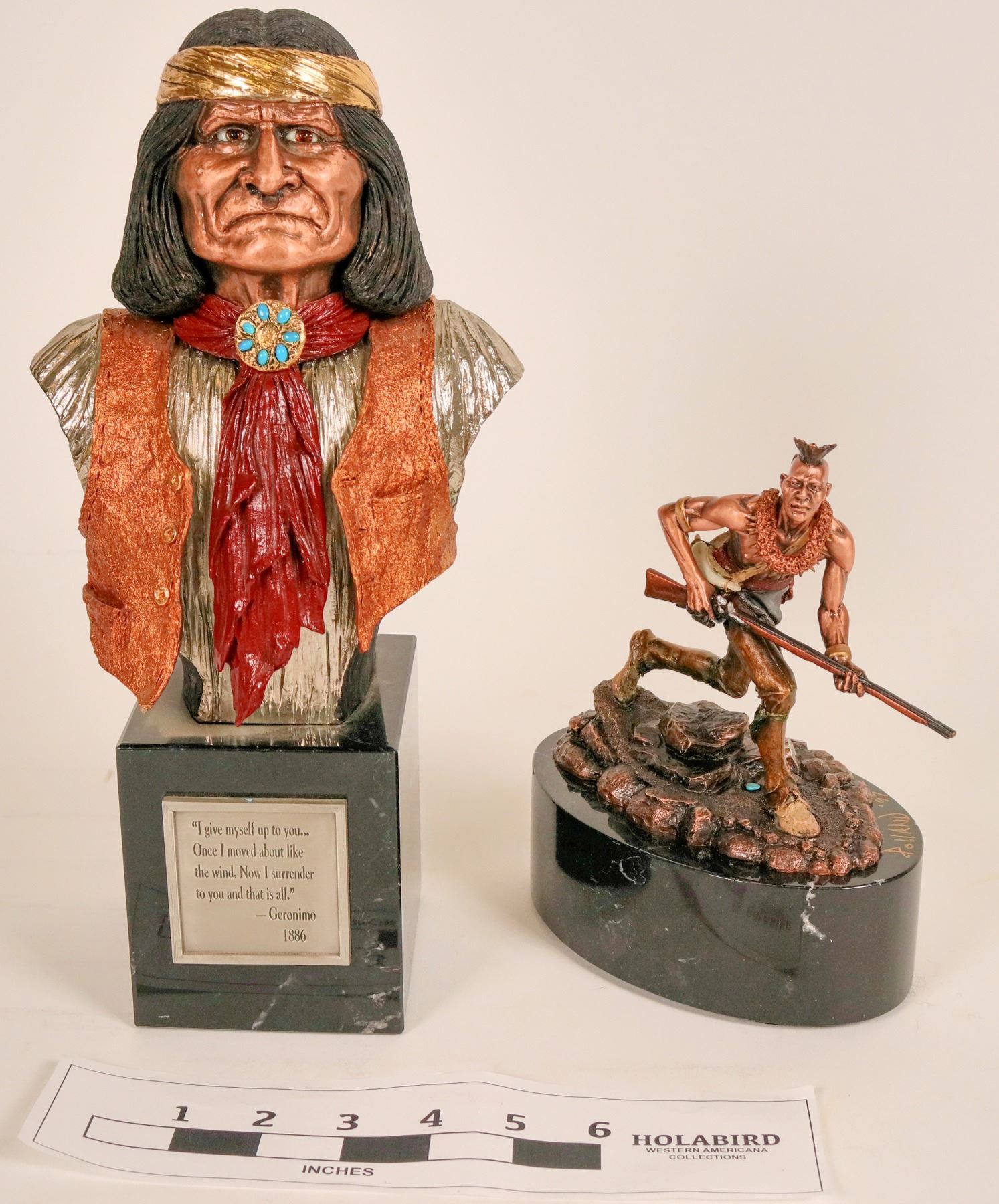 Two statues of Native American figures presented by Chilmark Fine Pewter. These finely detailed sculptures are copper coated pewter on a dark marble base. Included are: "Geronimo," a 12.5" tall striking sculpture of the prominent Indian figure, colorfully painted, with inset eyes, inlaid turquoise and the artist's signature, Joe Slockbower, with heavy "4" x 3.5" marble base , with plate inscribed with quote by Geronimo when surrendering; and "Soul of the Forest," copper rendition on oval marble base, 8" tall, base is 6" x 4", 1997, signed by the artist, Don Polland. These are done with great attention to detail.