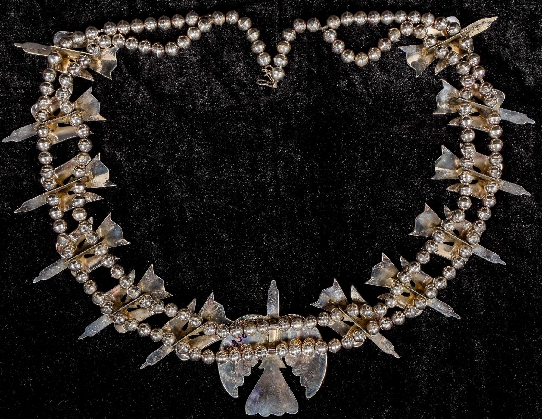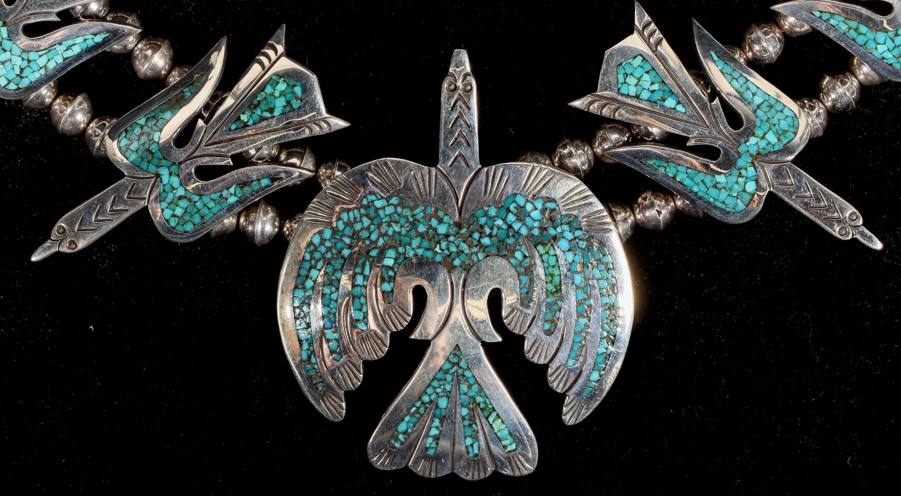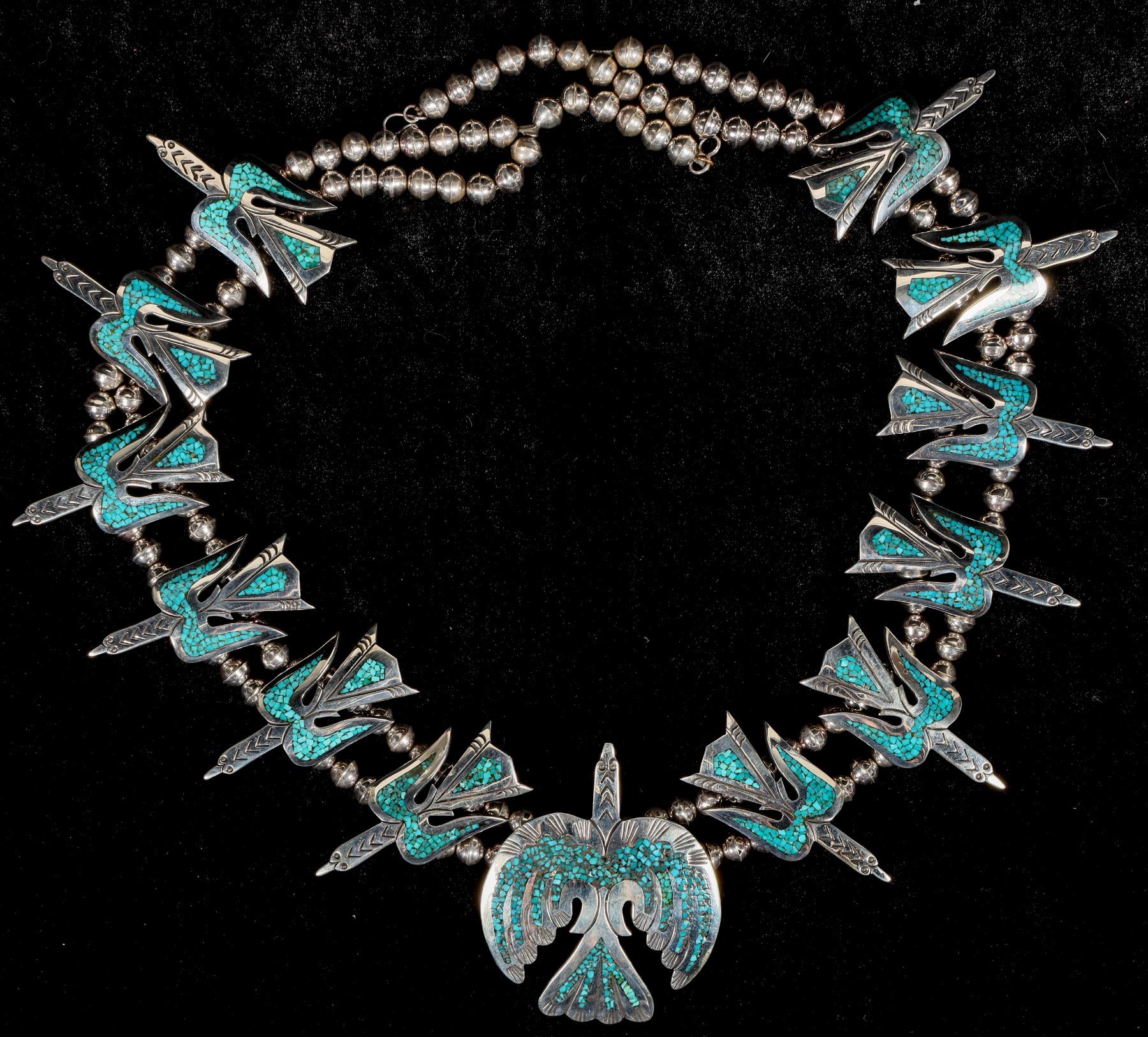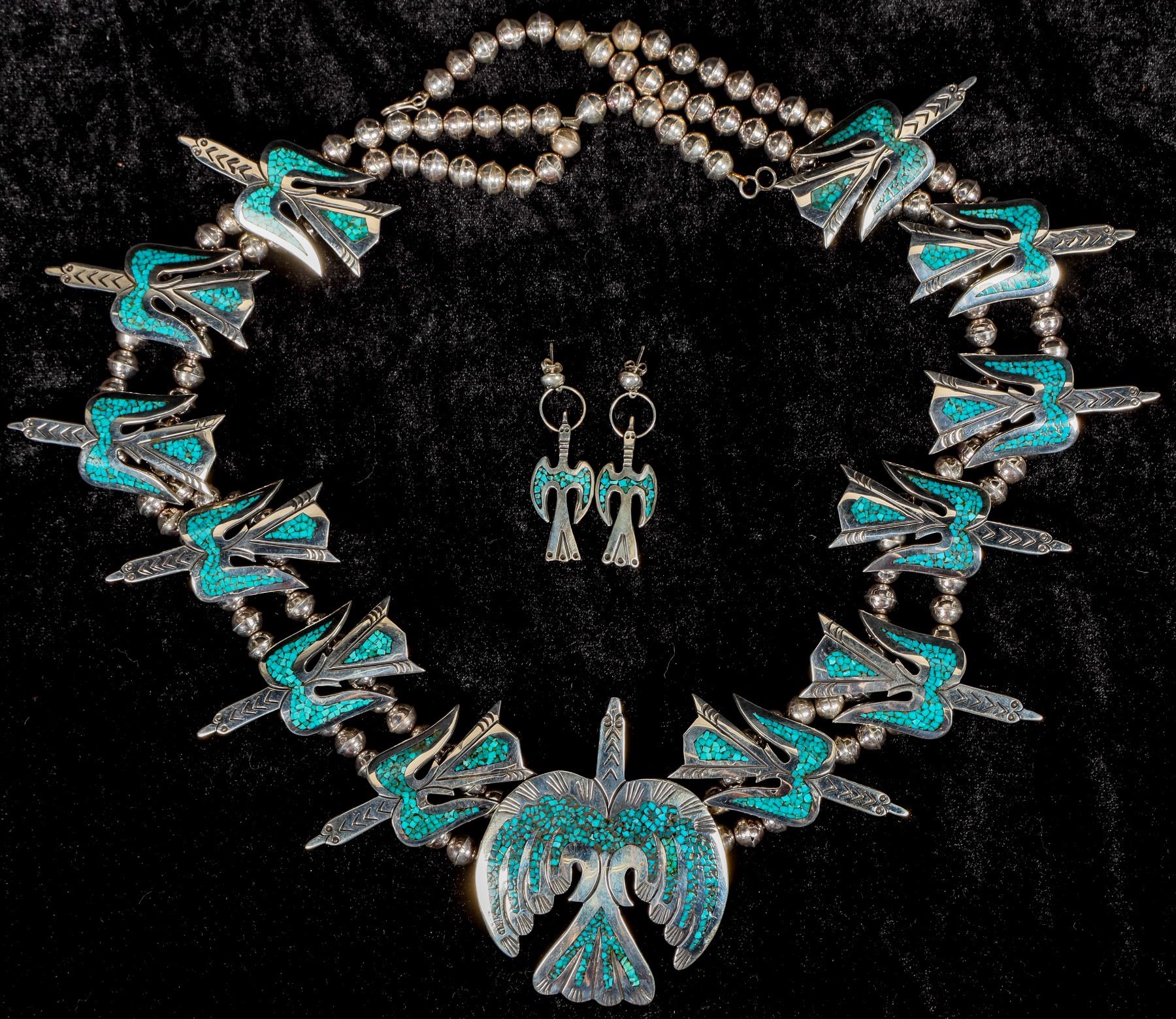 This squash blossom features beautiful chip inlaid turquoise and sterling silver 2 .5" Peyote Birds up and down both sides and one 2 .5" x 3" Peyote Bird figure at the base bringing the whole piece together along with matching earrings, the Peyote Bird also known as the Scissortail was one of the symbols that was closely associated with the recognition of those involved with the underground operation of the Native American Church because of it's use of peyote prior to it becoming legally recognized. This is a great eye catching and symbolic piece of the Native American Culture.