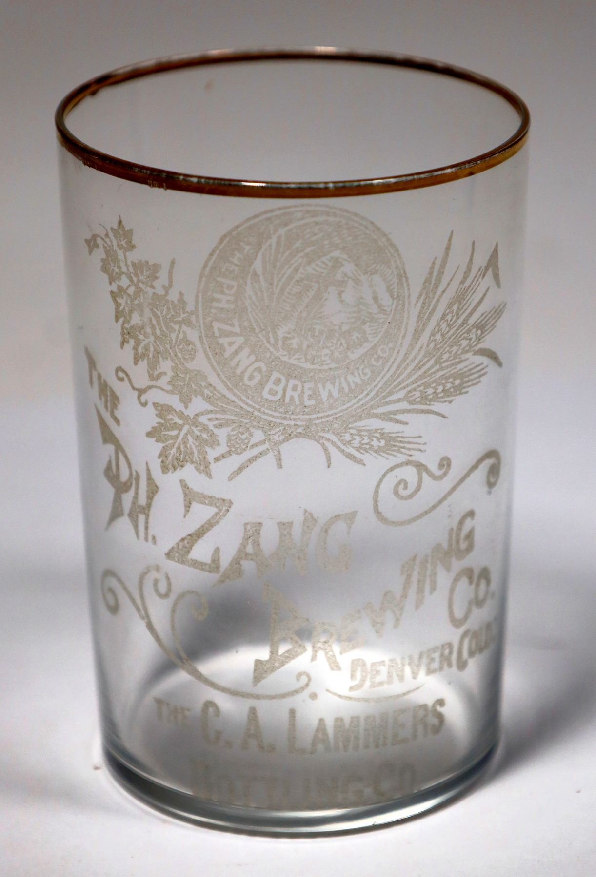 Gorgeous etched beer glass. (pictorial logo with company name and hops vignette) / The Ph. Zang / Brewing / Co. / Denver Colo. / The C.A. Lammers / Bottling Co. Gold rim, white lettering. 3.5"H x 2.25"W. Excellent condition with no obvious flaws! Philip Zang came to Denver in the early 1870s and bought the Rocky Mountain Brewing Company. He changed its name to Philip Zang & Co. When the company was bought by a UK syndicate in the late 1880s, the name changed to Ph. Zang Brewing Company.