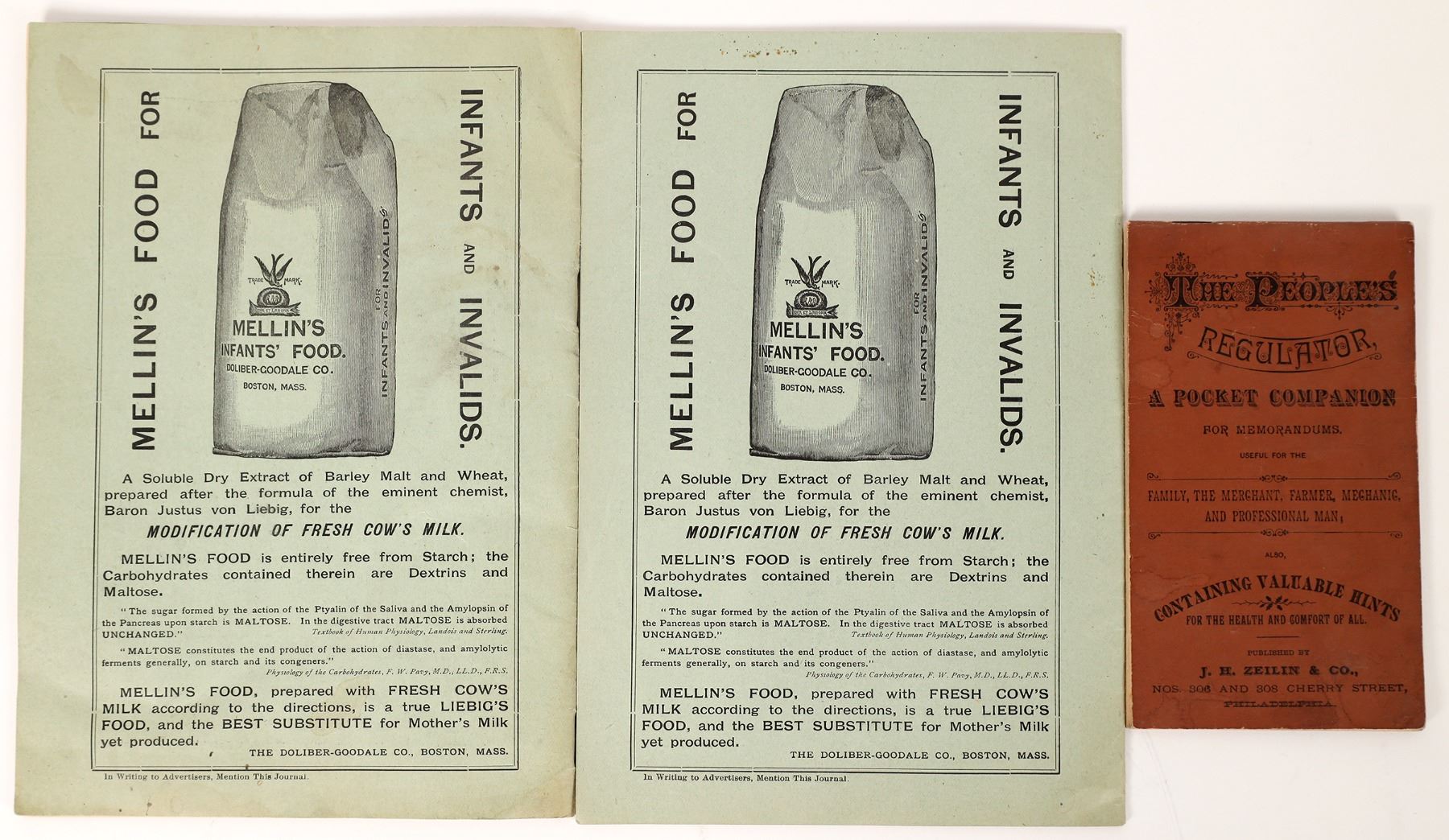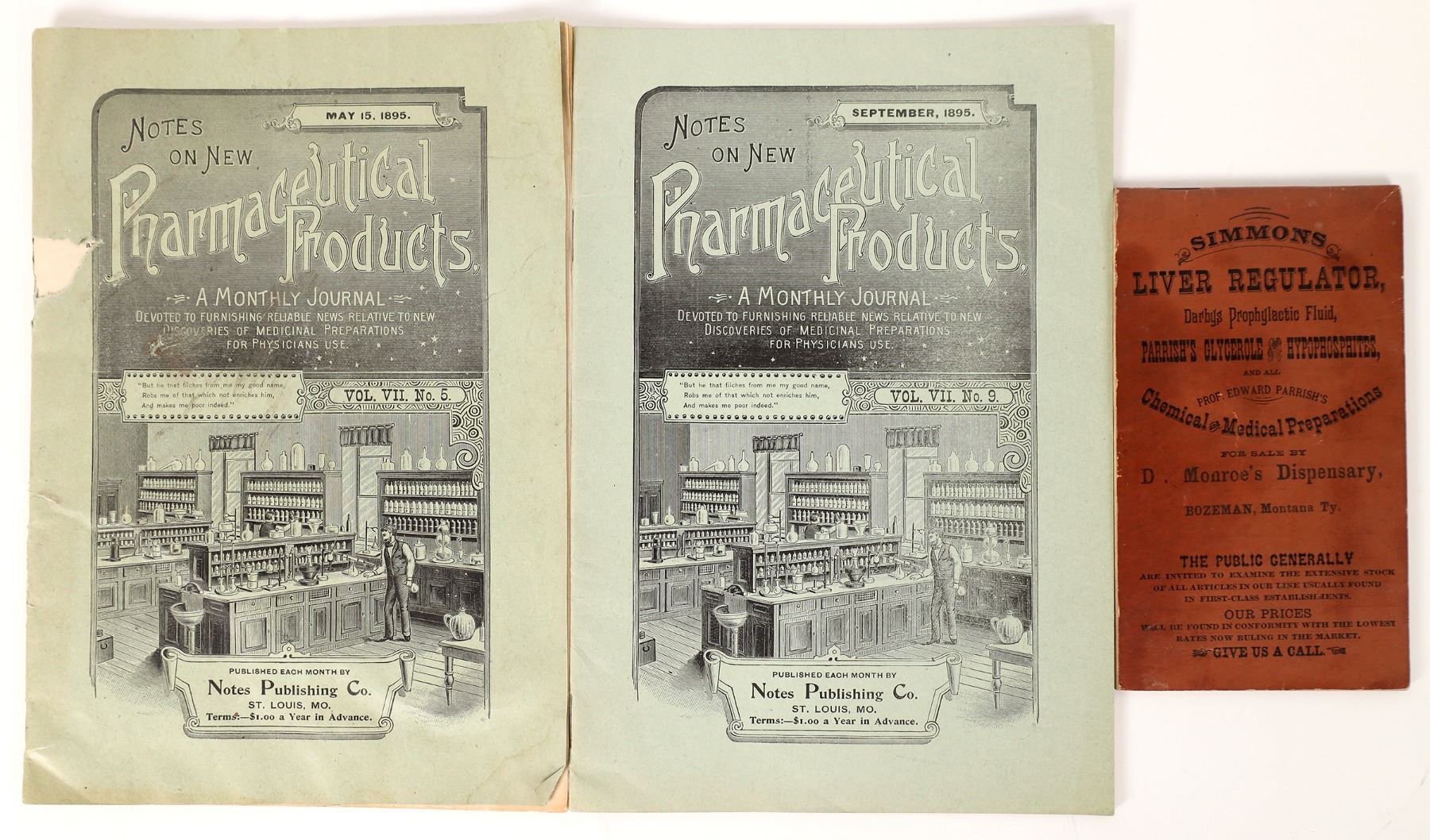 3 c. 1895 pharmacy pamphlets. Simmons Liver Regulator advertising notepad. 2 different 1895 Notes on Pharmaceutical Products.