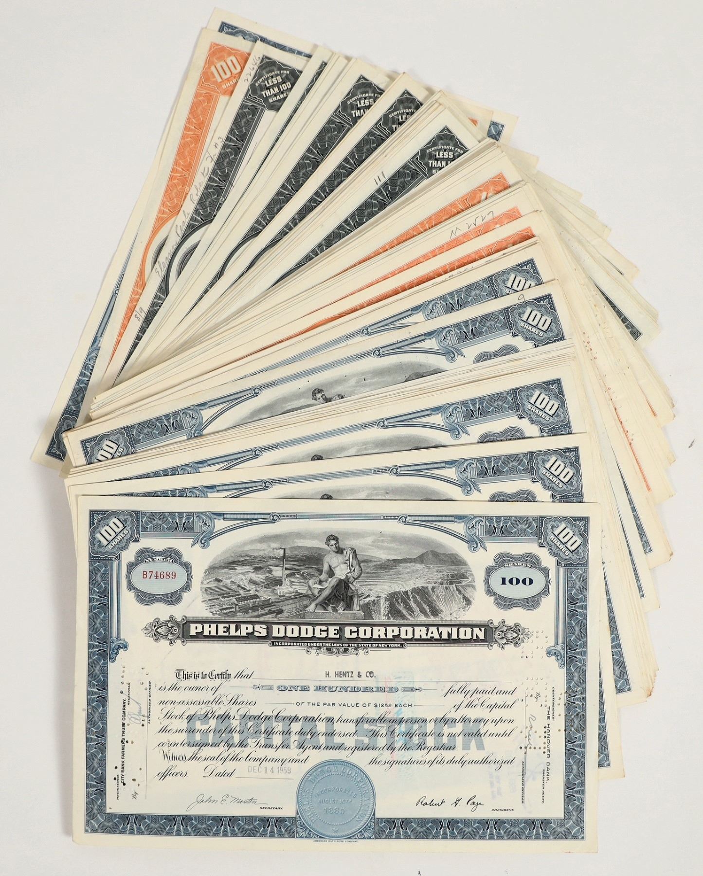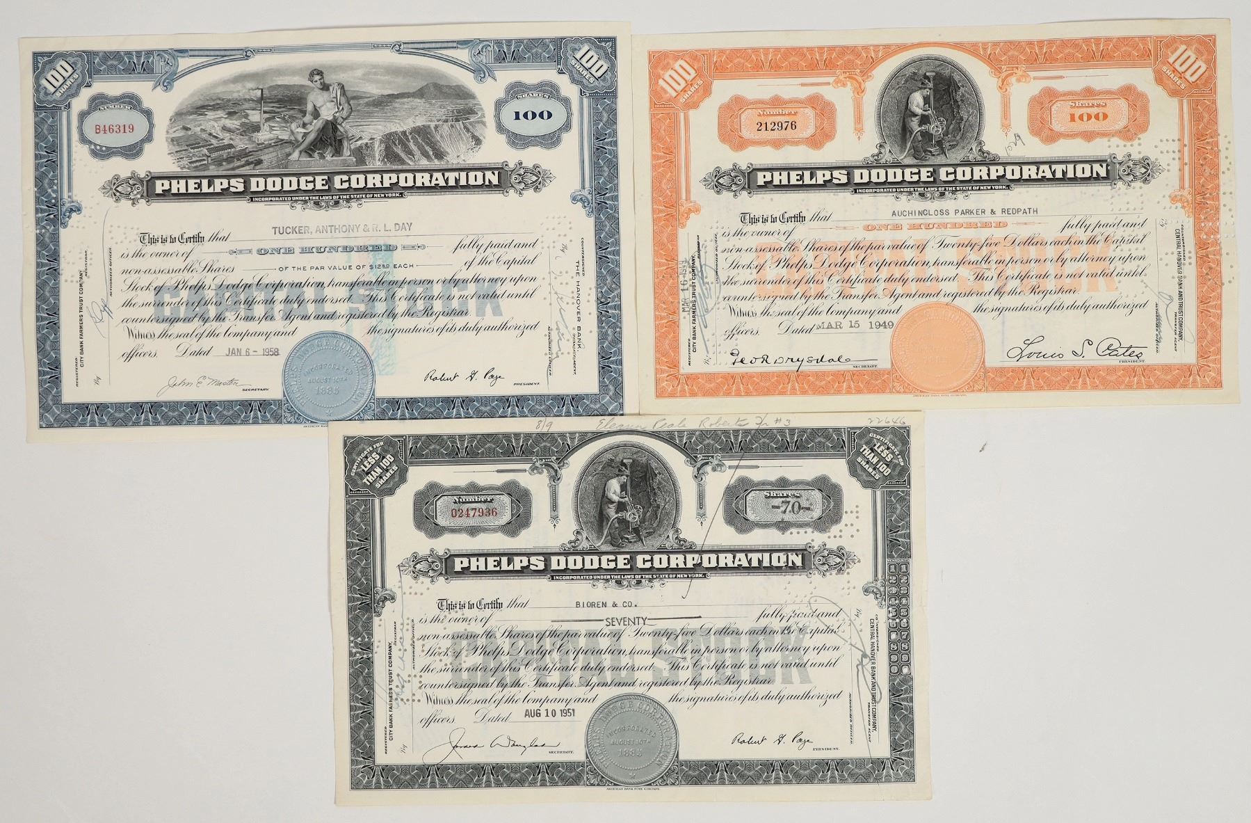 About 100 Phelps Dodge Corporation Capital Stocks c. 1940-50s . Issued. Four varieties. In 1950 Phelps Dodge Corporation had a significant presence in several locations, with its corporate headquarters being in New York City, and its mining and smelting operations centered in Arizona, particularly in Bisbee, Douglas, and Morenci. The company also had operations in New Mexico and Texas, and had incorporated in New York in 1885.