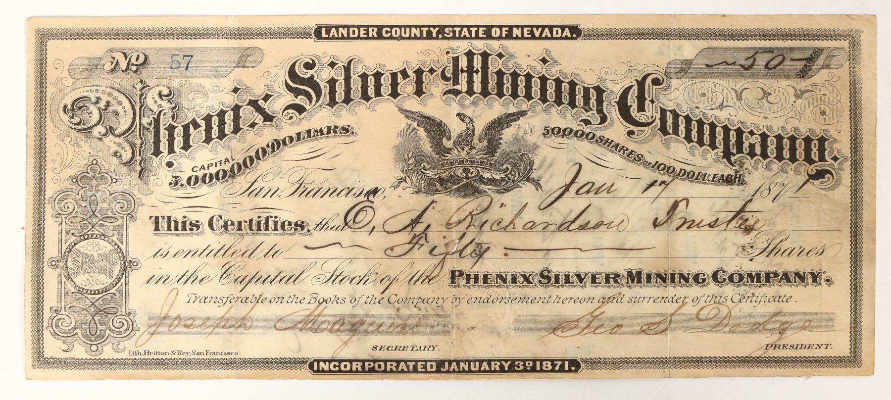 Inc. Jan. 3, 1871. Lander County, State of Nevada (printed at top). No. 57, issued for 50 shares to EA Richardson in 1871. Signed by Geo. S. Dodge as President and Joseph Maguire as company secretary. Vignette of phoenix at top center. Folds, pinholes, discoloration, and assessment stamps on the reverse. Lith. Britton, Rey & Co., S.F. 4.25" x 9" Operated at Ruby Hill in the Eureka District of Lander County (now Eureka County).