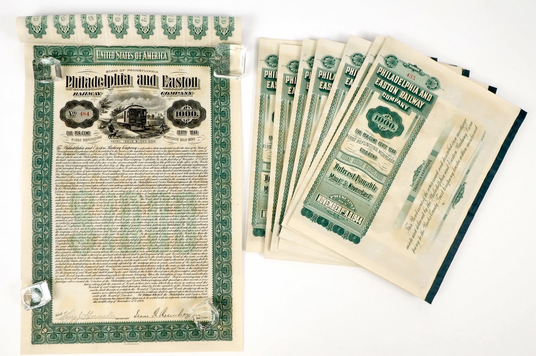 Lot of 10. I/U. Issued 1904. EF cond. Philadelphia And Easton Railway Co., $1000, 5% gold bearer bond with coupons. American BNC printer.
