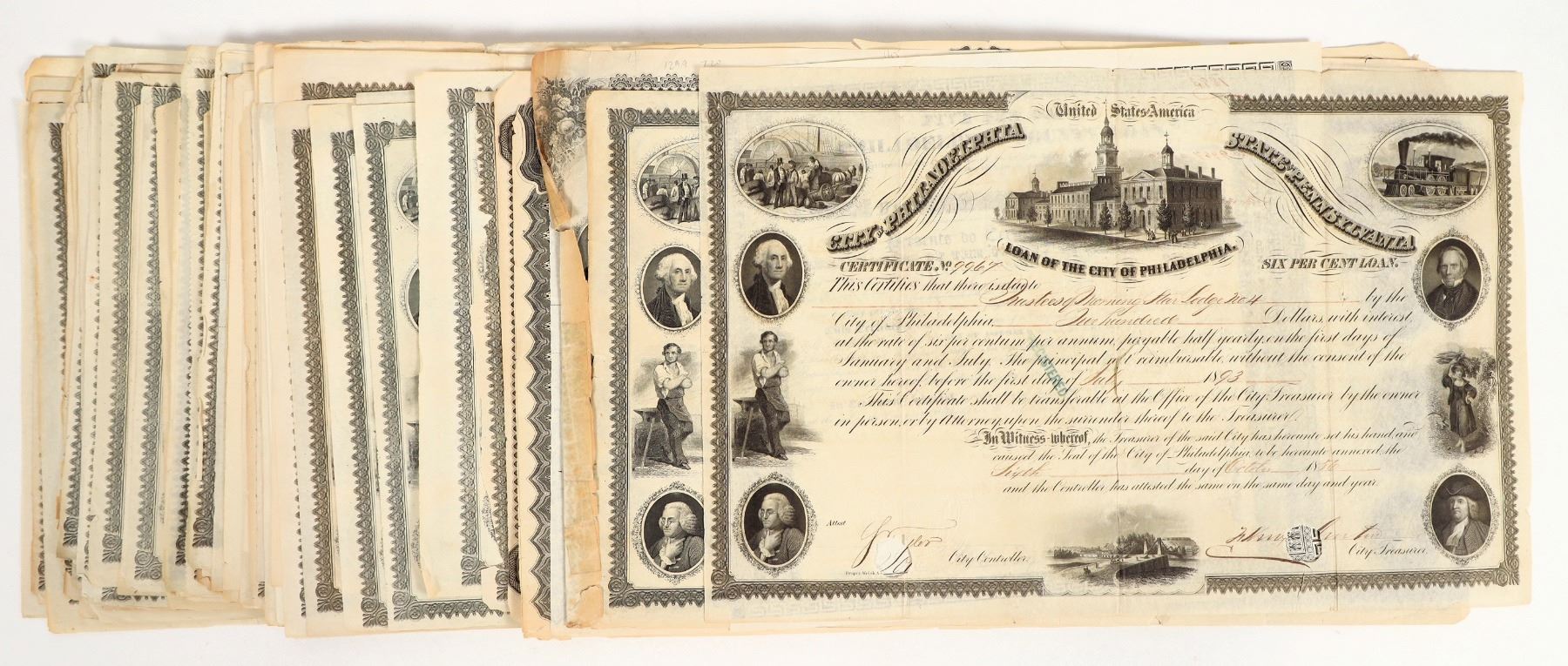 About 75 Early Philadelphia Bonds dated between 1850 and about 1875. Issued with many signatures. About 5 varieties. Some have underprint that says "Free From All Taxes". At least one early revenue stamp. Many have writing and signatures on reverse. In a brief look we found bonds issued to Charles Gilpin, the last Mayor of Philadelphia before the consolidation, Dennis Kennedy, famous English artist Hugh Bridport, Mrs. H. W. Ralston, Virginia Cooke and many others.