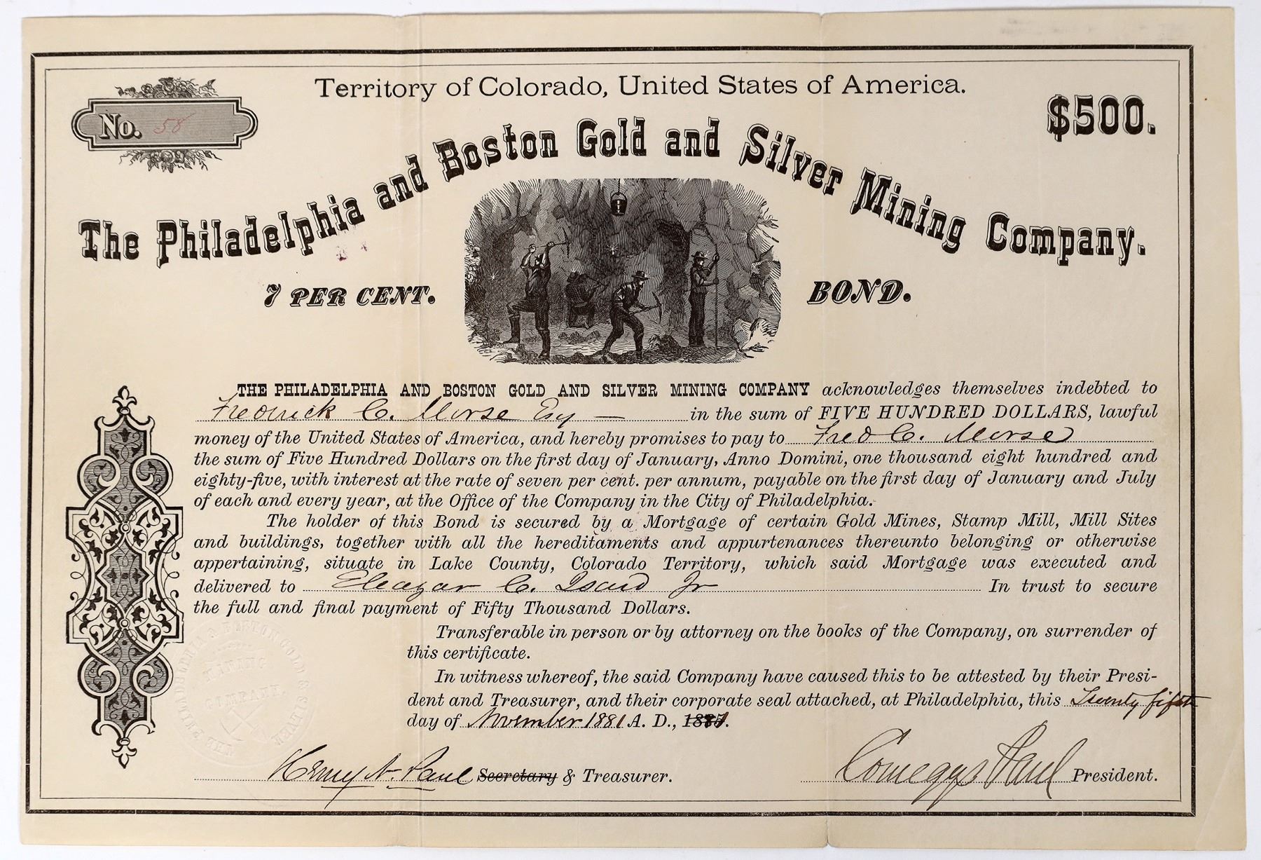 "Territory of Colorado, United States of America" (printed at top). No. 58, issued for $500 to Frederick C. Morse on November 25th, 1881. Signed by president Paul and treasurer Henry Paul. Not cancelled. Black border and print. Vignette of four miners working underground with an ore bucket suspended above them. 7.5 x 11" Deep folds. Text on certificate says the property is in Lake County, Colorado Territory. This company is not listed in C&L or Fossett. According to The Colorado Weekly Chieftain (July 20, 1876), the company operated on the Printer Boy Lode in Lake County, and were producing native gold and gold nugget specimens. In 1882, they were patenting the Five Twenty Lode in the California Mining District of Lake County and had their headquarters at Oro City (Leadville Daily Herald, October 21, 1882).
