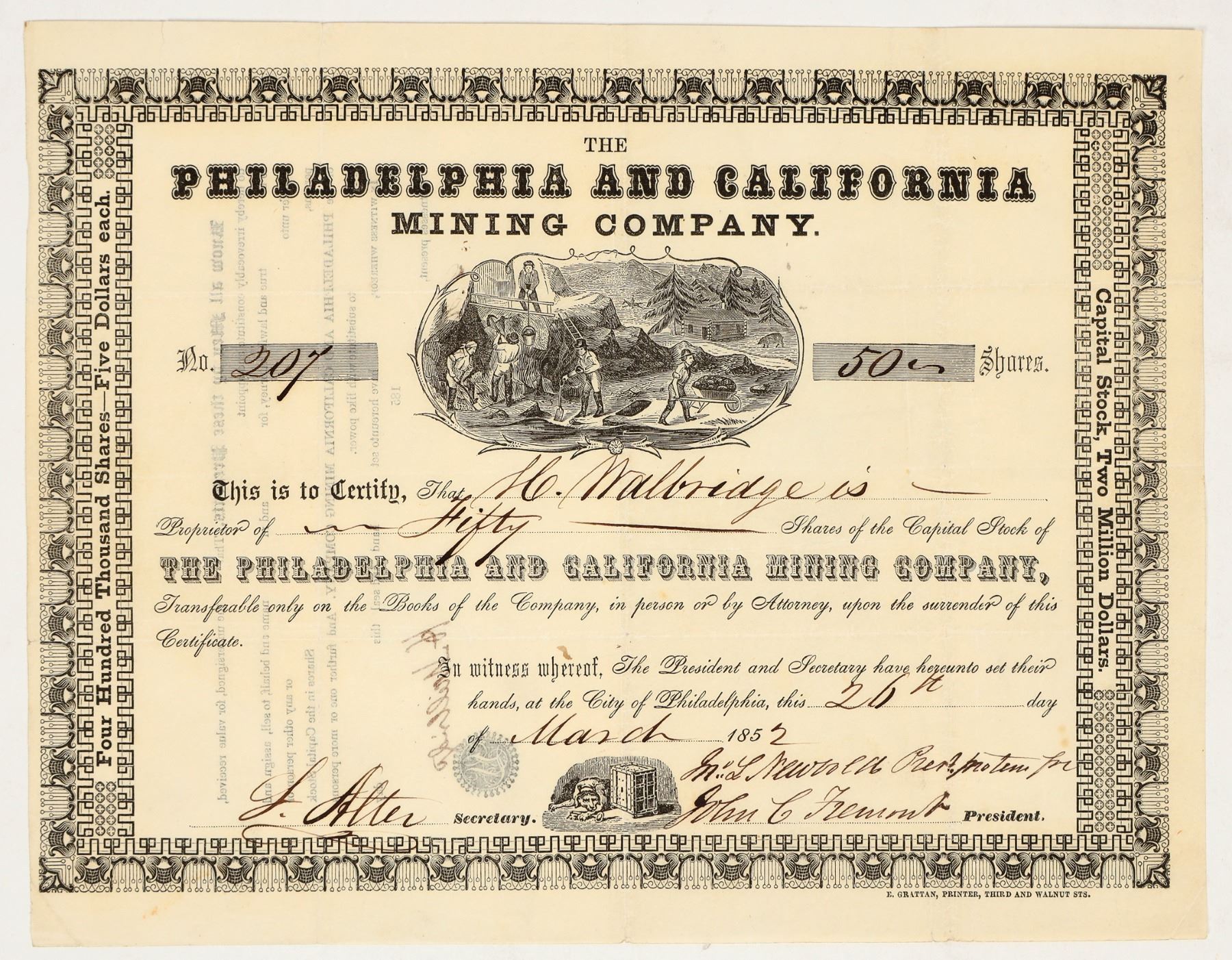 Choice early Gold Rush stock certificate. No. 207, issued for 50 shares to Walbridge in Philadelphia in 1852. Signed by Newfold(?) for John C. Fremont as president. Also signed by secretary Alter. Not cancelled. Mining and dog next to safe vignetted. 7.5 x 9.5" Folds, clean. The Philadelphia and California Mining Company was founded in the same year on the basis of a land lease from John Fremont in the area of the Mariposa River. Although Fremont leased out mining claims to many companies, this is one of the very few he had a hand in.