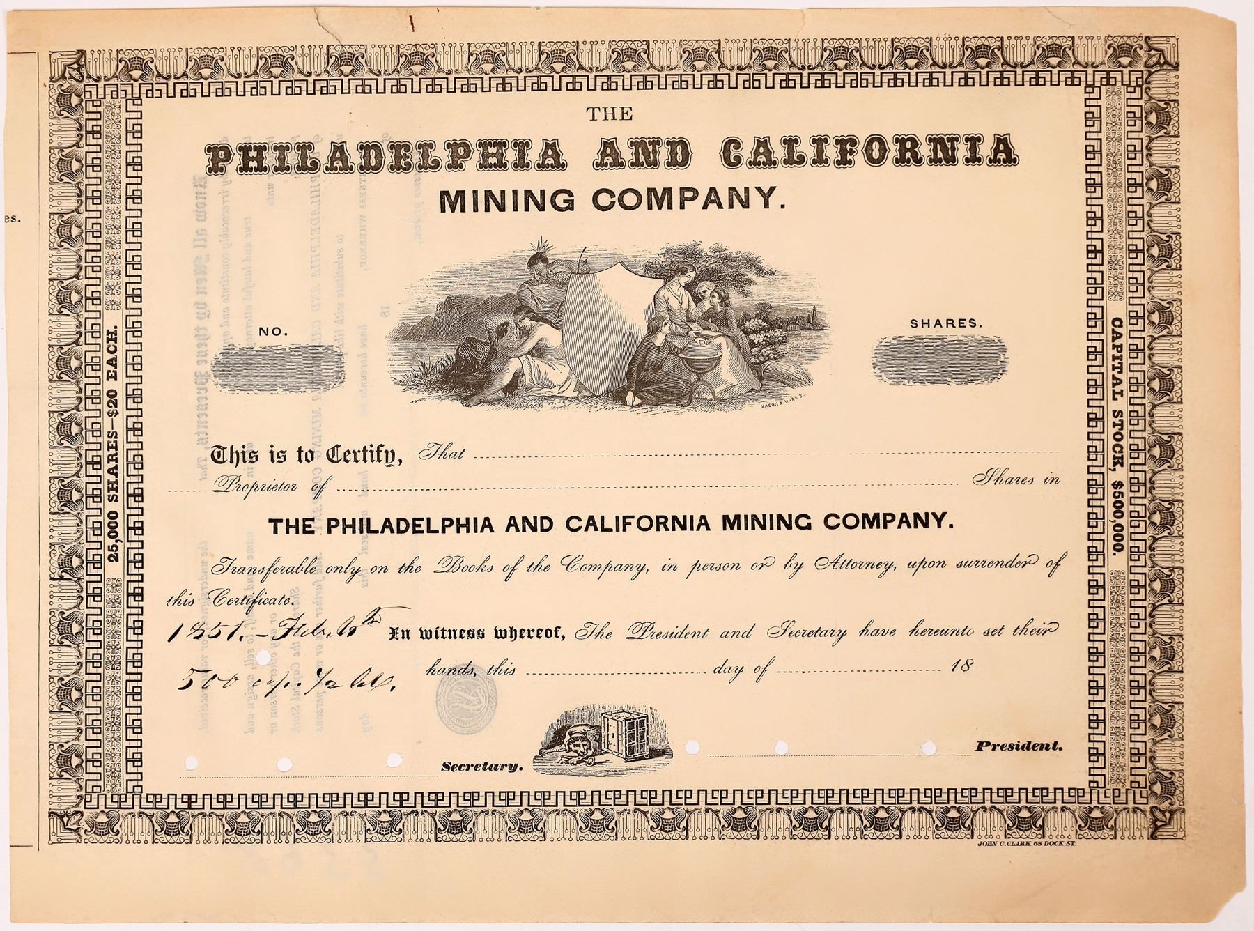 This unissued stock certificate is by the Philadelphia and California Mining Company of Mariposa County. Black border on white paper 7 in. X 10 in. The center vignette is of an Indian family and an Anglo. family separated by a shield and a the bottom center is a dog and safe. The Philadelphia and California Mining Company was one of three mining ventures that was "hands-on" for John C. Fremont. (Holabird 2000, p.91). No fold creases, one corner chipped, very fine condition.