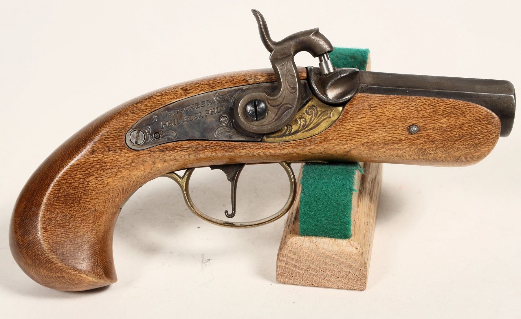 This is a .45 caliber derringer replica made in the 1970's by Jukar. S/N 132241. Black powder only percussion. Construction is very good. 3.25 in. barrel length 8 in. overall length. No FFL required. Please see photos for details.