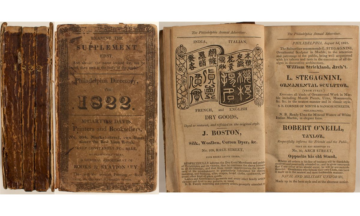 M’Carty & Davis publishers. Includes new names to the 1821 Directory. 97 page supplement full of history: A list of all lieutenants in the United States Navy, employees of the Custom House, authorized inspectors of lumber, etc. Book is fragile and needs to be cared for. Binding broken in two. Pages age stained. Front and back cover almost unhinged. Pages are bound tight and difficult to turn. [Rarity: i]City: PhiladelphiaCounty: State: PADate: