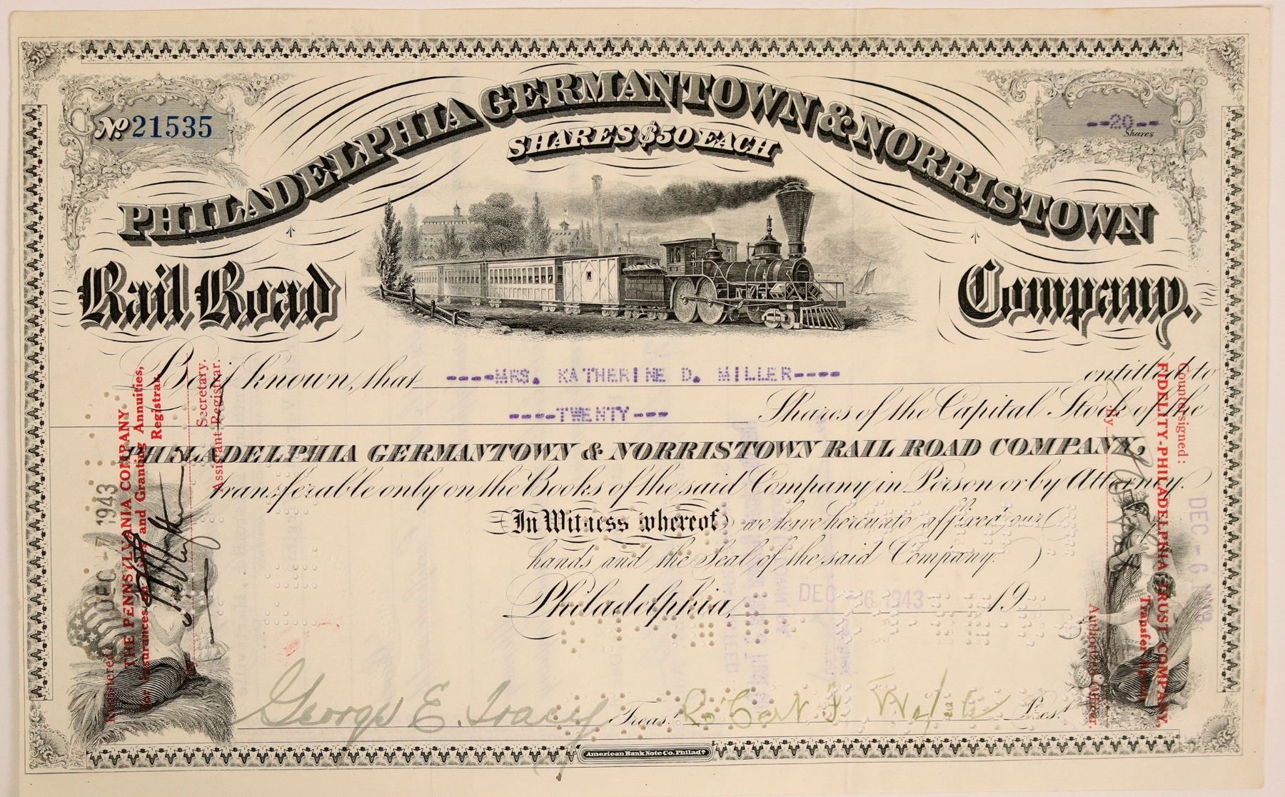 Incorporated under the laws of Pennsylvania on February 17, 1831. It was one of the first railroads in the Philadelphia area. The PG&N became part of the Reading Railroad system under lease in 1869 and became the Reading's primary entrance for passenger trains into Philadelphia. The PG&N remained an independent company and was liquidated in the late 1970s. #21535, I/C, 20 shares @ $50 ea. Issued Dec 6, 1943. Signed, not readable. Black, embossed seal w/center of steam roller pulling carriage. Vignettes: top Train l-r, allegorical females left (American flag) and right (agriculture). American Bank Note Co. Only a specimen is thought to exist. VF