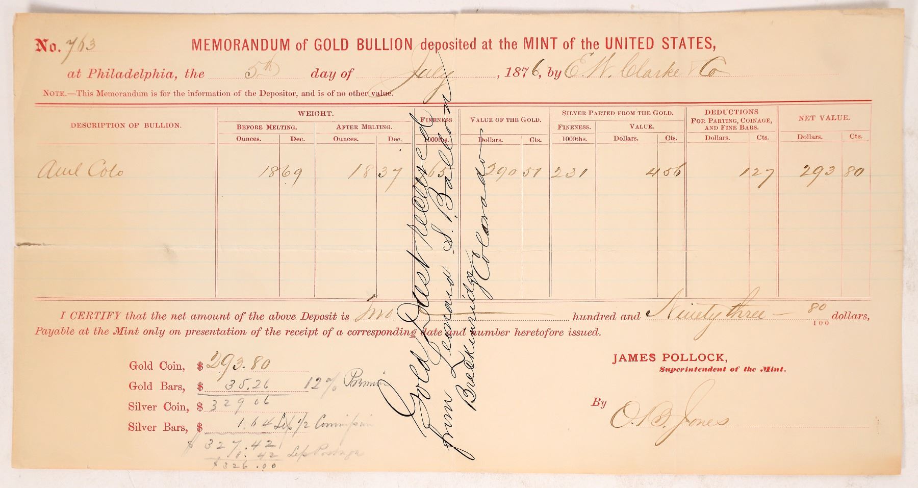 Rare Philadelphia Mint gold deposit, 1876 submitted by E.W. Clarke & Co from Colorado amalgam (18.69 ozs). Note on obverse states: Gold Dust received from Leonard S. Ballou, Breckenridge, Colorado. While the Branch Mint at Denver was easily available to the depositor, many deposits headed for the NYAO as well as the Main Mint in Philly received the deposits direct from those regions through associated eastern bankers. Philadelphia Pennsylvania Franklin Collection