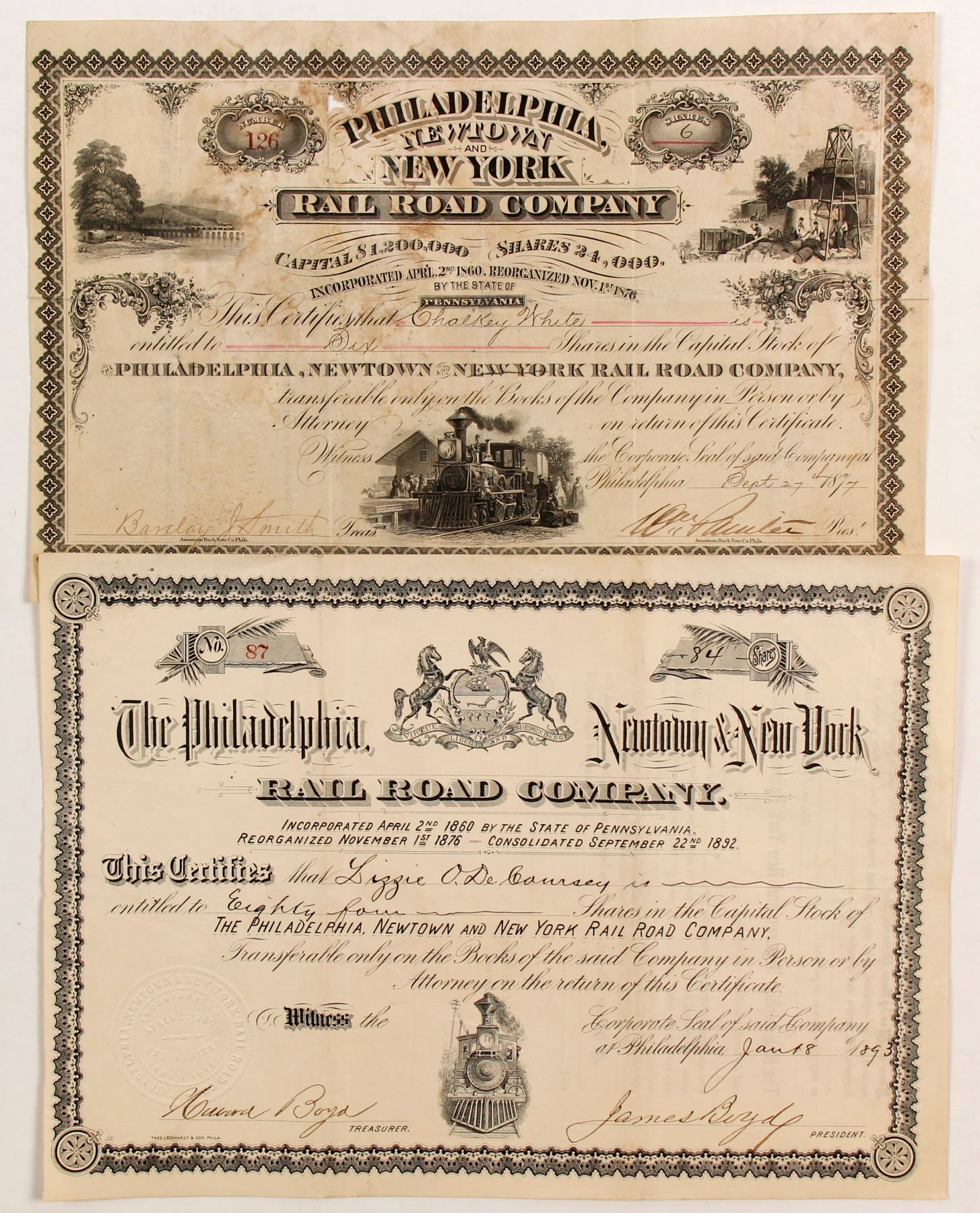 Unlisted in 1st edition. #126 Chalky White 6 shares 1877 signed by President illegible, 3 nice vignettes-creases, toning and hole, rough condition.#87 Lizzie DeCoursey 84 shares 1893 signed by President Boyd-pin holes. State: City: Date: 1877-1893 HWAC# 84260