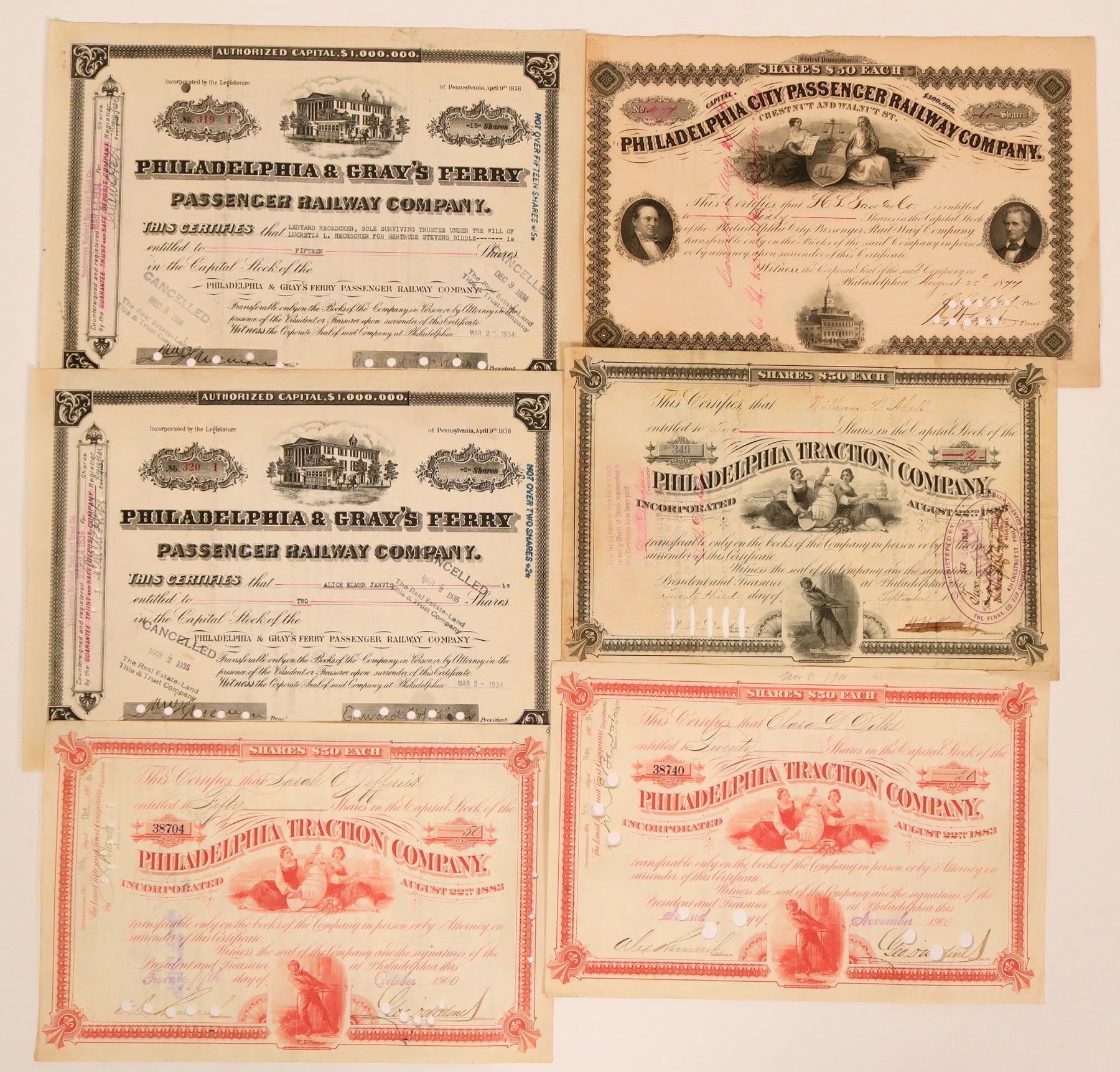 6 certificates. 1. Philadelphia Traction Co. incorp. 1883. The first cable car line in the City of Philadelphia was opened on Columbia Avenue from 23rd Street to Fairmount Park by the Philadelphia Traction Company. Introduced the first electric cars in the city. Two Orange and one black certificate I/C, shares $50 par issued 1884-1900, signed George Widener President, embossed seal, vignettes: top inder wavy title two woman seated state seal center, bottom brakeman. Revenu stamps on one. American Bank Note Co. VF