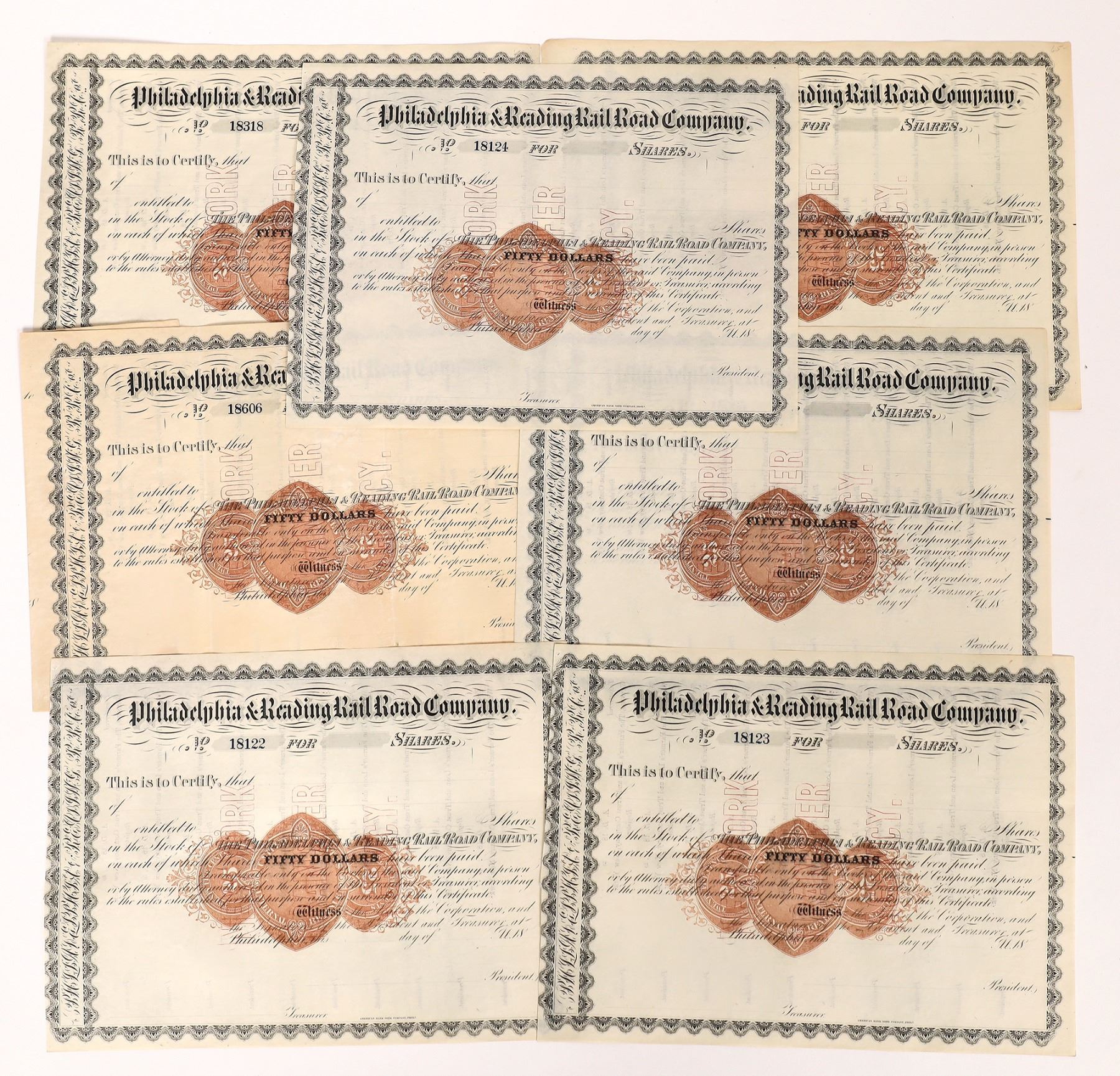 6 u/i Philadelphia Rail Road stocks. Brown 25c imprinted Internal Revenue stamps. Pennsylvania Ken Prag Collection