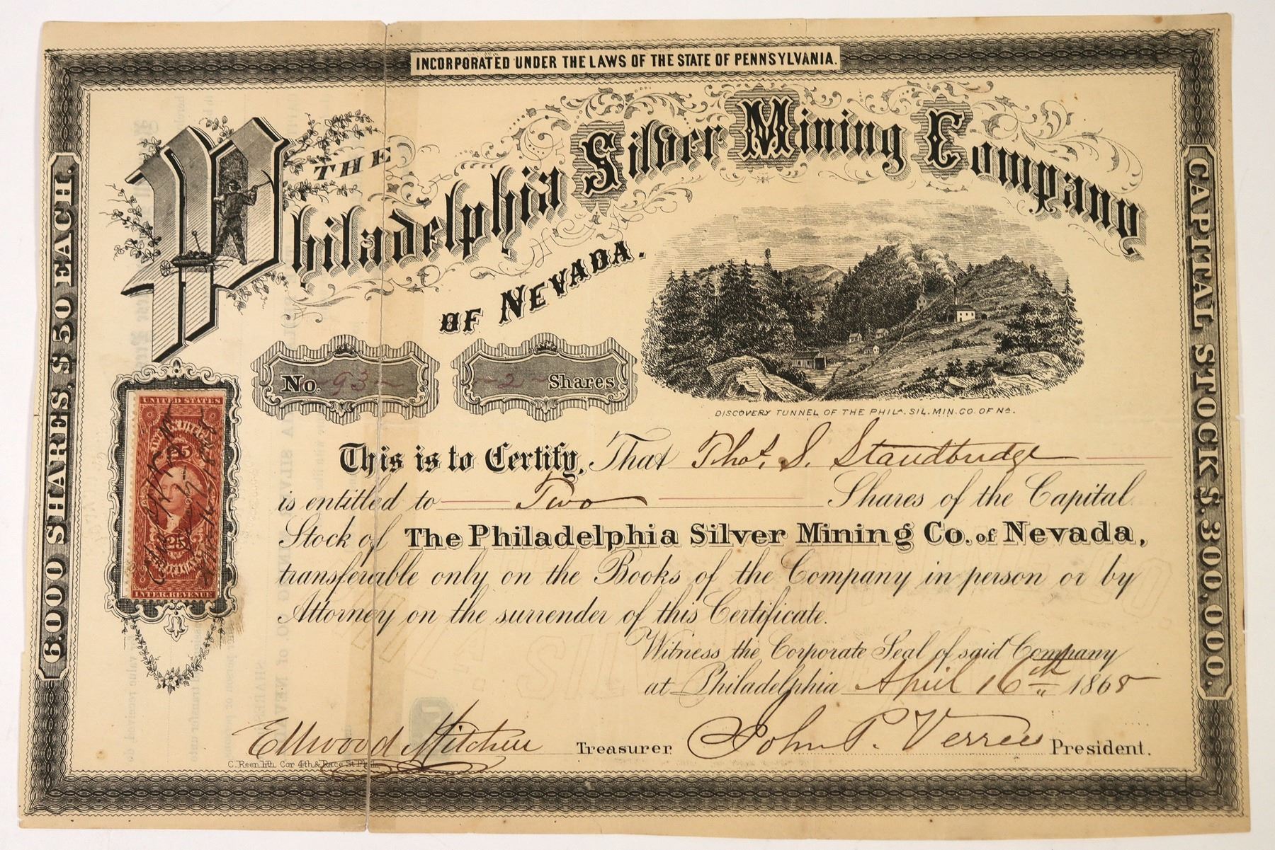 This is a WOW cert with both the good and the bad. The good is the vignette. It is entitled, "Discovery Tunnel of the Phila. Sil. Min. Co. of Nv." Spectacular. The bad is the left third of the cert has been torn off and is now held in place with tape. # 93 for 2 shares to Thomas Staudbudge. Located August district. Signed by Elwood Mitchell and John Verru as president. Dateline Philadelphia April 16, 1868. Scrolled in hard to read silver underprint is 'Phila. Silver Mining Co.' 25c Certificate Revenue stamp. Not cancelled. C Reen printer. Outside of rip, nice condition. This company was originally called the El Dorado Mining Company and was incorporated in May of 1864. The name was changed in 1866. "Todd and Welton (1866) placed the historic Augusta district in this area, east of the present Bernice district. The General Land Office map (1866) shows the Augusta district to cover most of the central Clan Alpine Mountains, including Augusta Canyon and the present Tungsten Mountain district." [Nevada Mining Districts by Tingley]