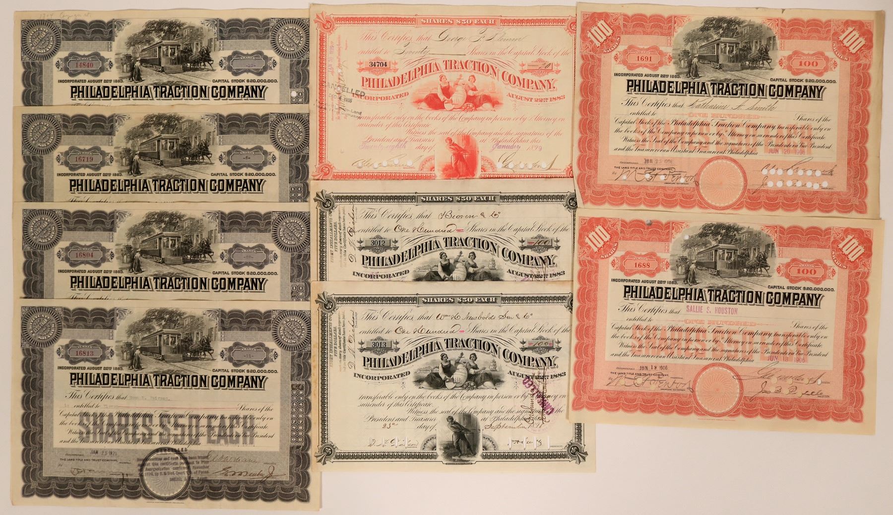 9 certificates. Philadelphia Traction Co. incorp. 1883. The first cable car line in the City of Philadelphia was opened on Columbia Avenue from 23rd Street to Fairmount Park by the Philadelphia Traction Company. Introduced the first electric cars in the city.