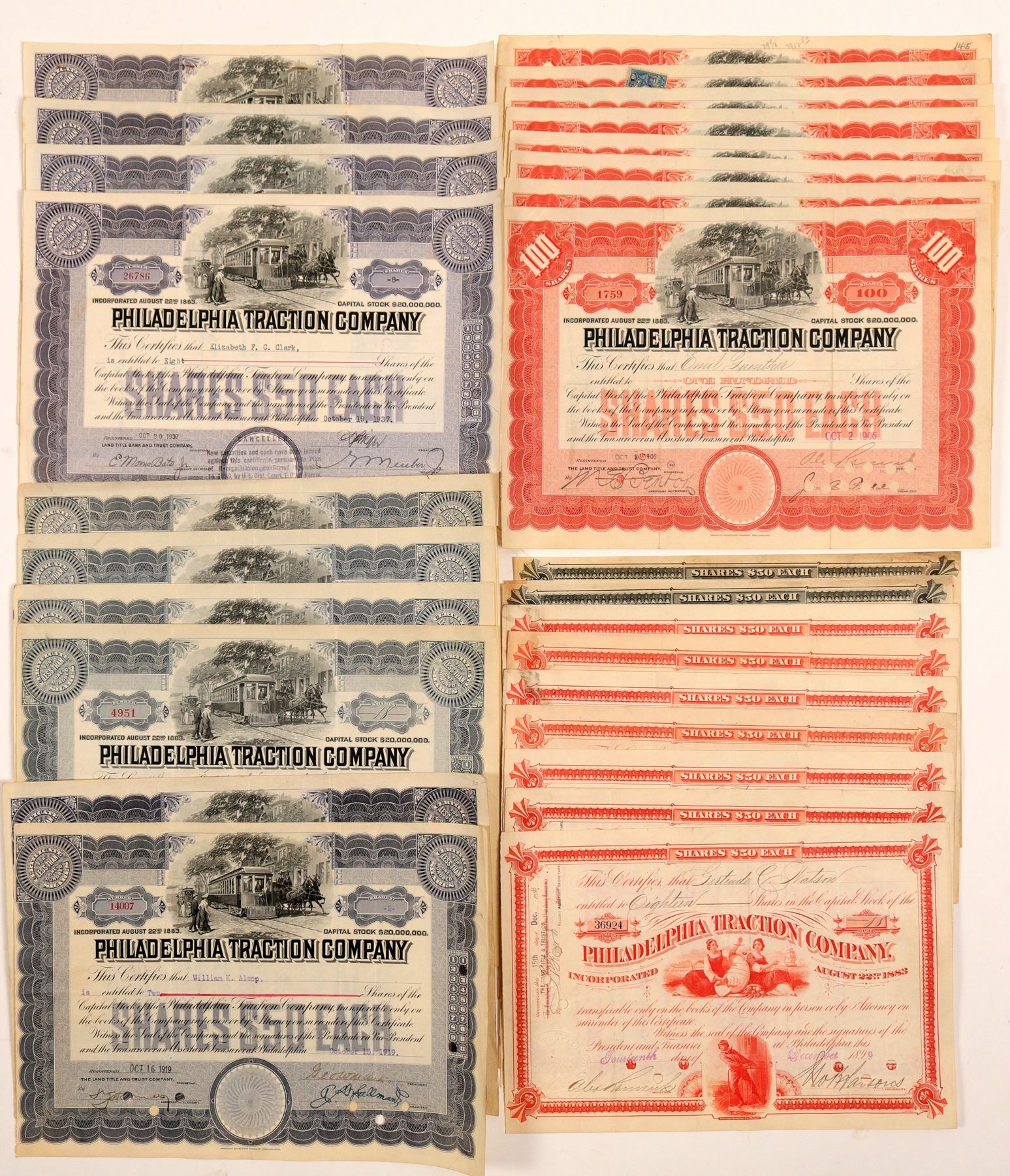 1) Cancelled 18 certificates of Philadelphia Traction Co stock (12" x 8-1/2"), signed by president and treasurer. Raised seal bottom center of certificate. Incorporated Aug 22, 1883. Colored (red or gray) border. Vignette of cable car on track on top center of certificate. RN Stamp on 1 certificate. Printed: American Bank Note Co. 2) Cancelled 10 certificates of Philadelphia Traction Co stock (11" x 7-12") Signed by Treasurer and President or Vice President. Inc Aug 22, 1883. Colored (red or gray) border. Vignettes: 1) engineer on back of train 2) 2 women in center by shield in front of town with sailing ship on water. Red border. Registered. Printed: American Bank Note Co. Ken Prag Collection Ken Prag Collection