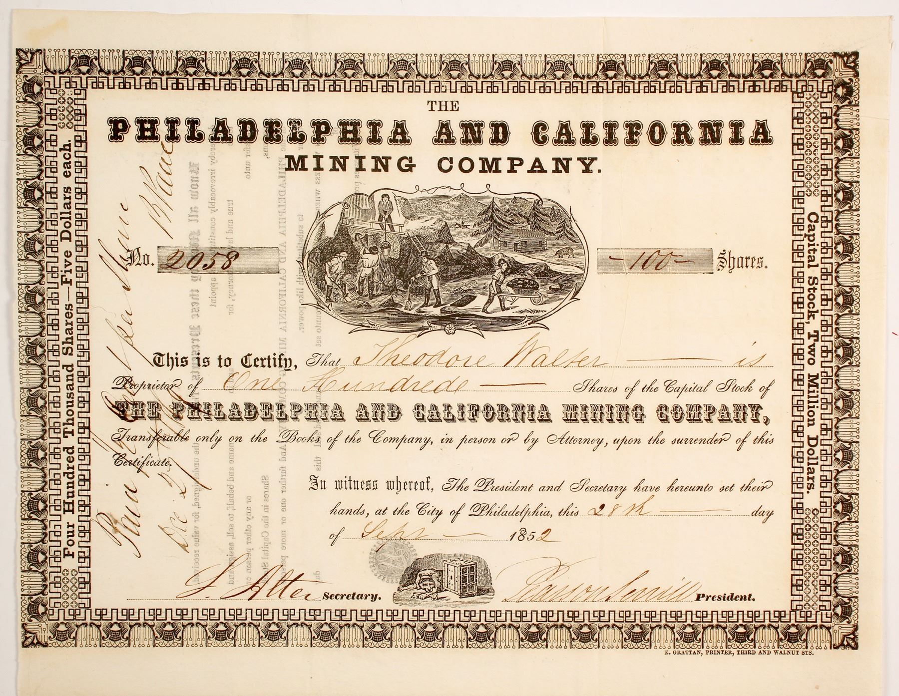 # 2058 for 100 shares to Theodore Walter. Signed by Solomon Alter and president Parson Sewill. Dateline Philadelphia 1852. Incorporated 1851. Above ground quartz mining vignette. Not cancelled. Cut close on left. No edge, corner, pin hole or discoloration issues. Includes a copy of the Articles of Incorporation, By-Laws and lease information. This was a lease from none other than John C Fremont. Letters and notes explain the advantages they have received and gives a detailed list of the mines (New Britain, Heap and Sargent) and where they are located. This background information just makes this great stock certificate that much greater!