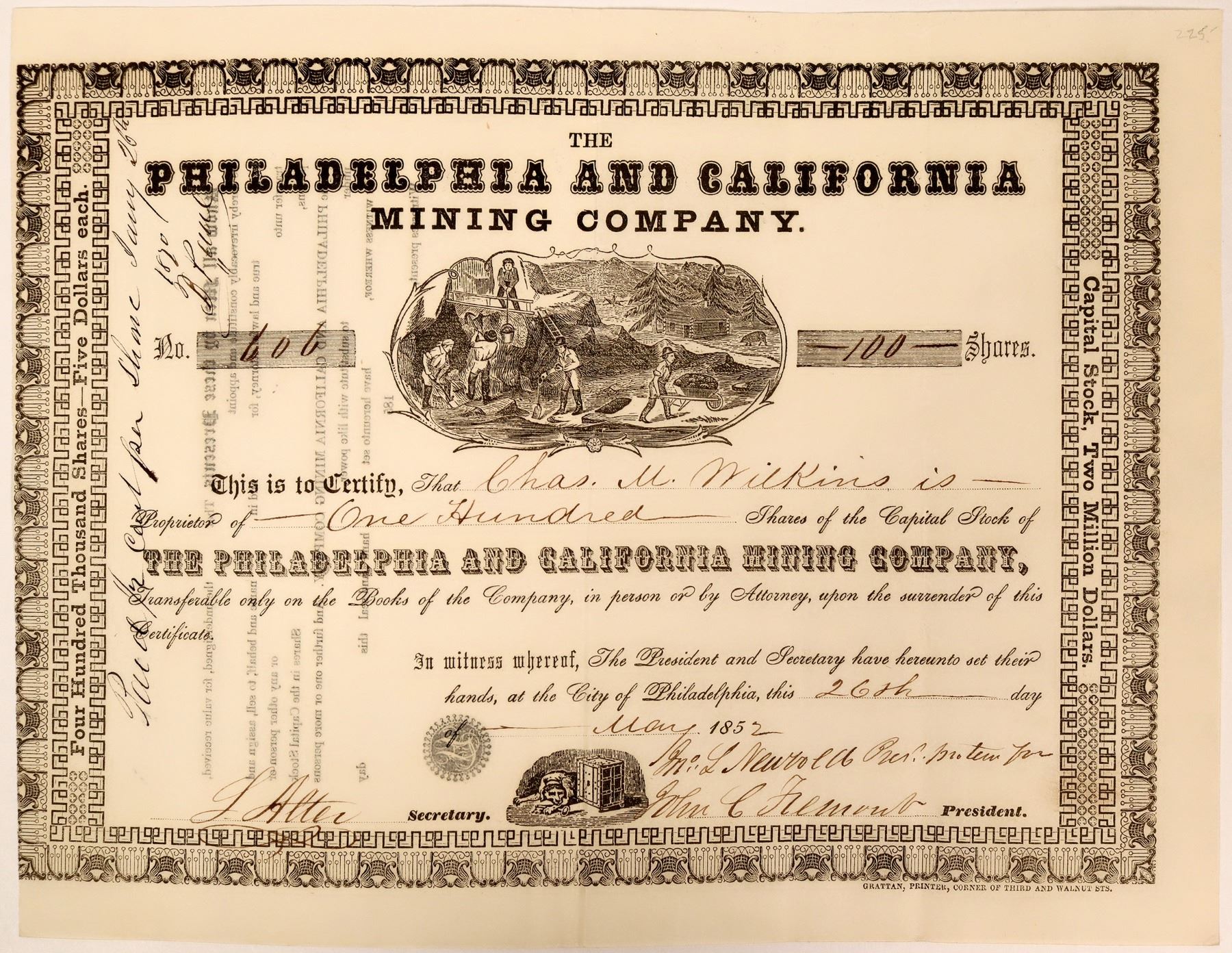 Although not rare, this is an important early California stock certificate. But what makes this one special is the reference on the certificate to John C. Fremont. It clearly states that Fremont is the president. It is, however signed by "ML Newfold, president pro tem for John C. Fremont." We have seen a few of these stocks come through our auction house lately, but none that reference Fremont. # 606 for 100 shares to Charles Wilkins on May 26, 1852. Signed by Newvold and secretary Alter. Printer was Grattan at the corner of Third and Walnut. The central vignette depicts a mining scene representing the company's California operations. The Philadelphia and California Mining Company was founded in the same year on the basis of a land lease from John Fremont in the area of the Mariposa River. Although Fremont leased out mining claims to many companies, this is one of the very few he had a hand in. An extremely rare piece of mining ephemera. One fold. Cut unevenly at left. No other corner, edge, discoloration or pin hole issues. Extremely fine.