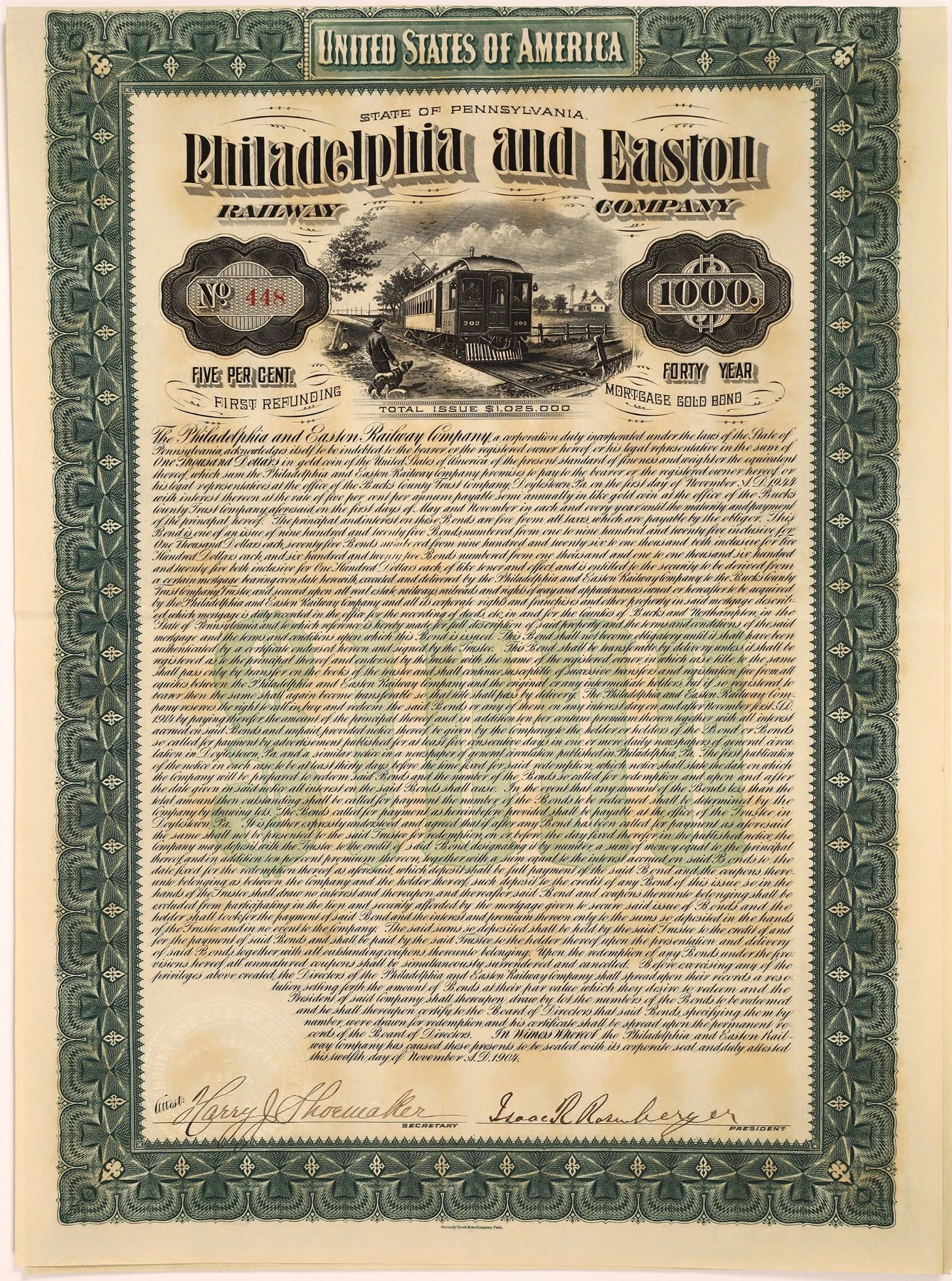 Philadelphia and Easton Railway Company $1000 5% 40 year bond, signed by president Rosenberger(?), #448. Nice Railway Car vignette. All 80 coupons attached. Light discoloration throughout. Pennsylvania