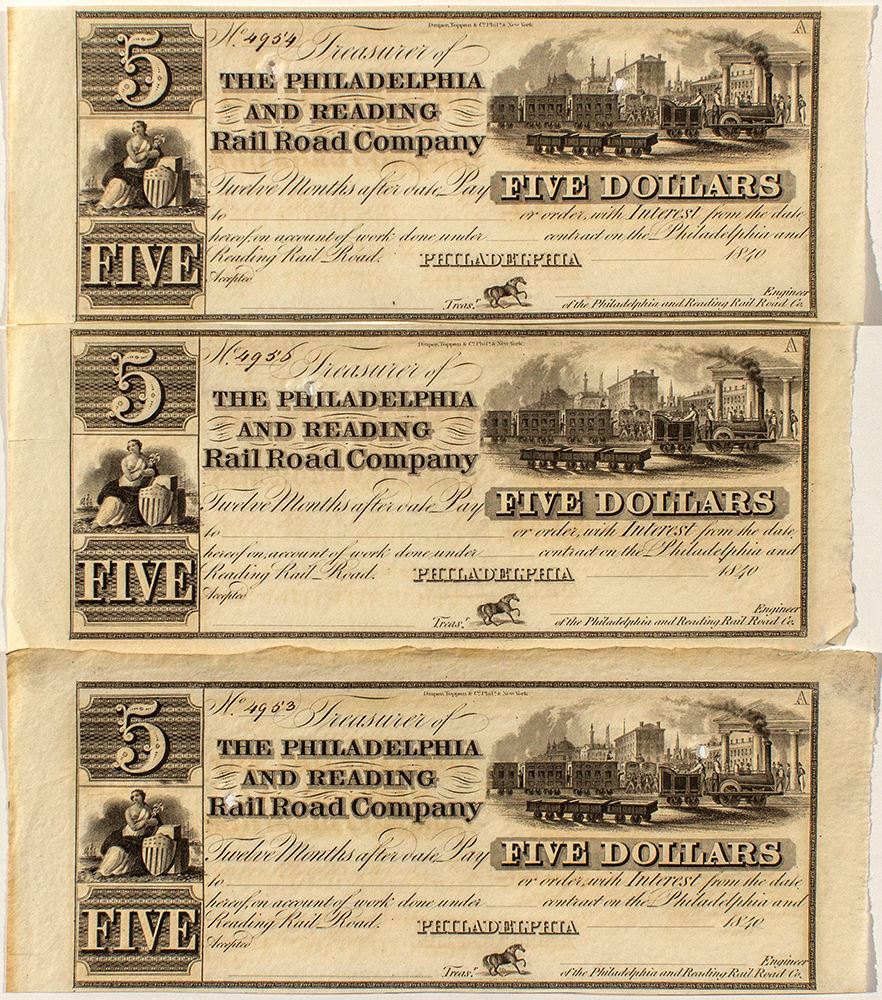 Three unissued pieces of illustrated $5 scrip, all from 1840. Great locomotive vignette upper right, allegorical woman left center. Printed by Draper, Toppan & Co.Delicate paper with pinholes, creases/bends and light foxing. Each measures 3" x 8.5" (Prag Collection)