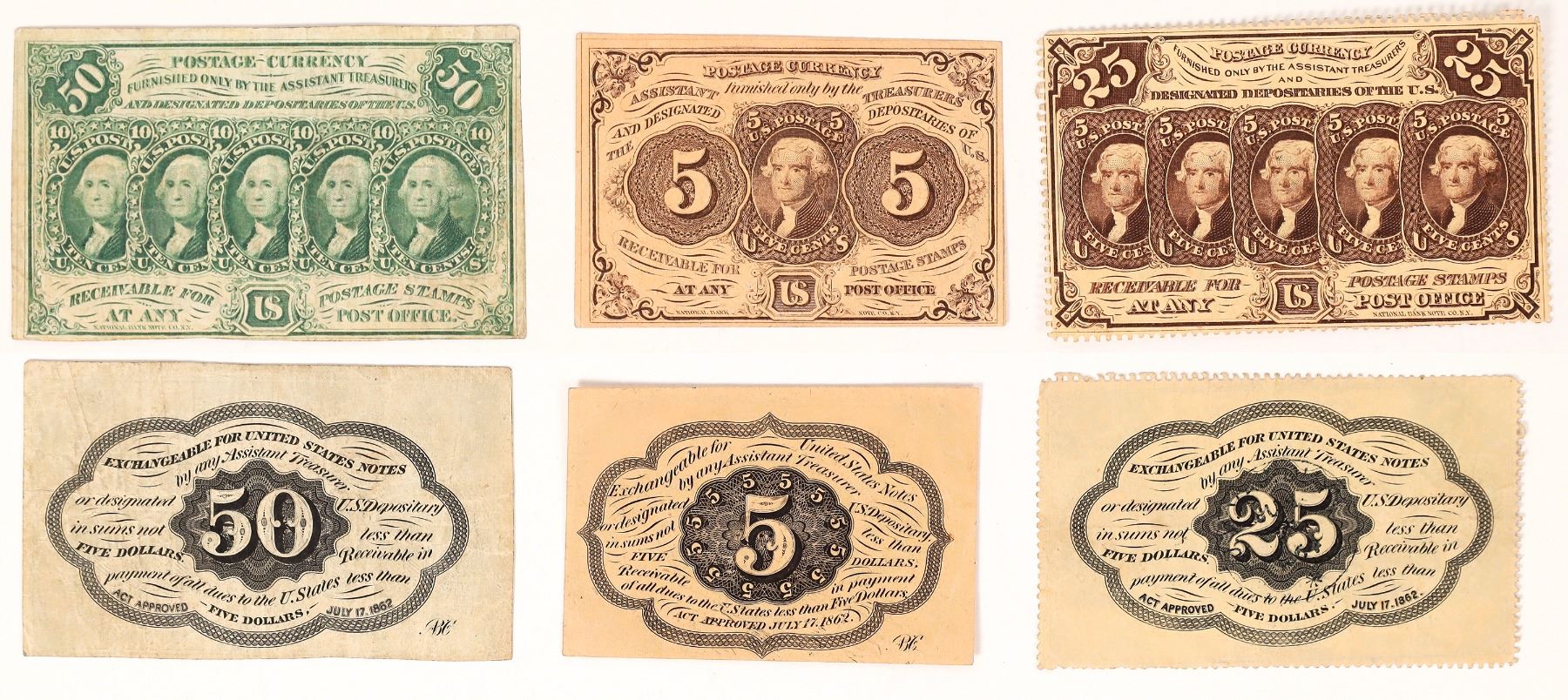 Philatelists take note! Stamp collectors! Currency collectors! Three pieces: 1) Fr#1230, 5c First Issue, CU; 2) Fr#1280, 25c First Issue,CU; 3) Fr#1312, 50c First Issue, AU or UNC with dirt.