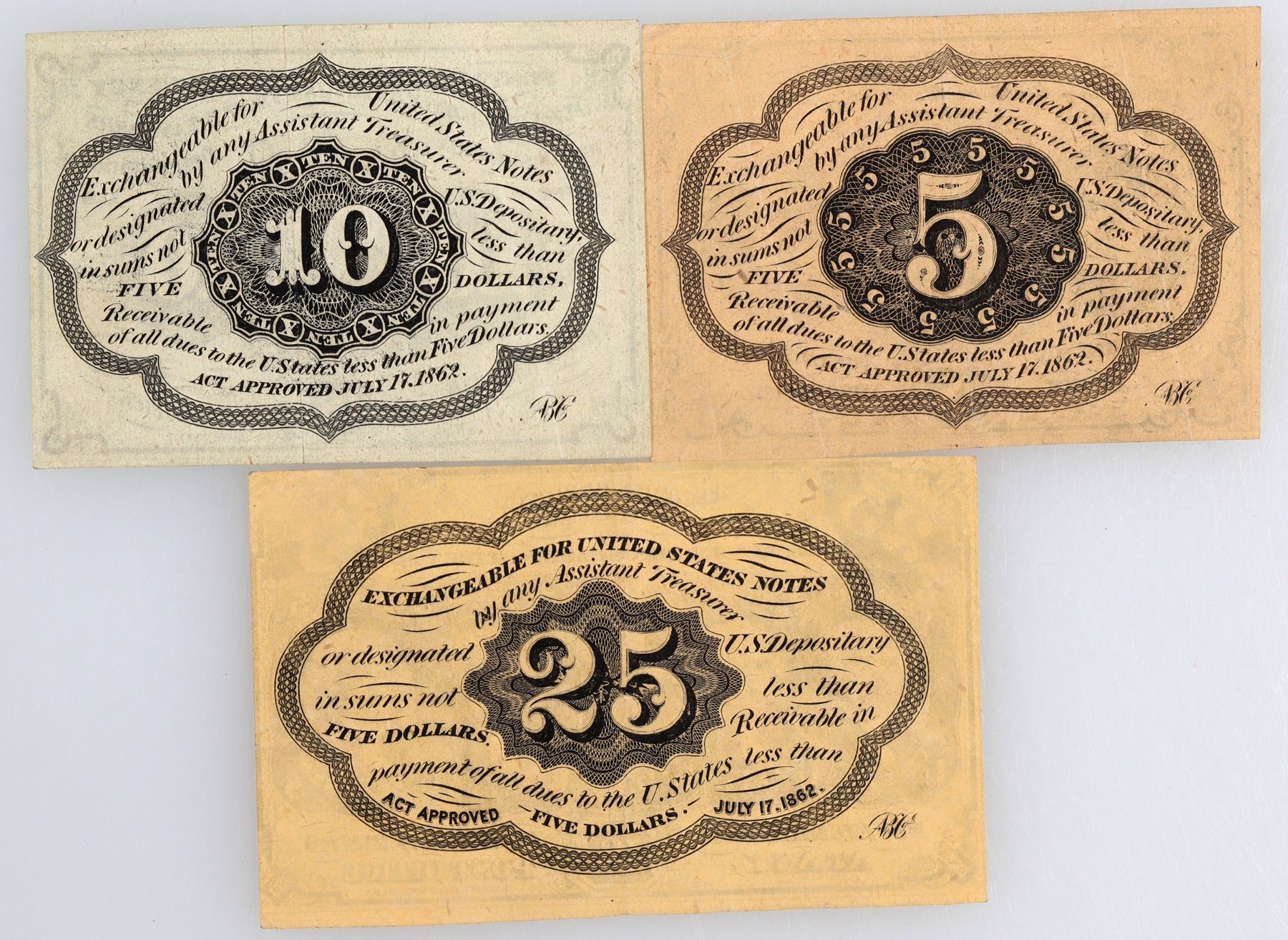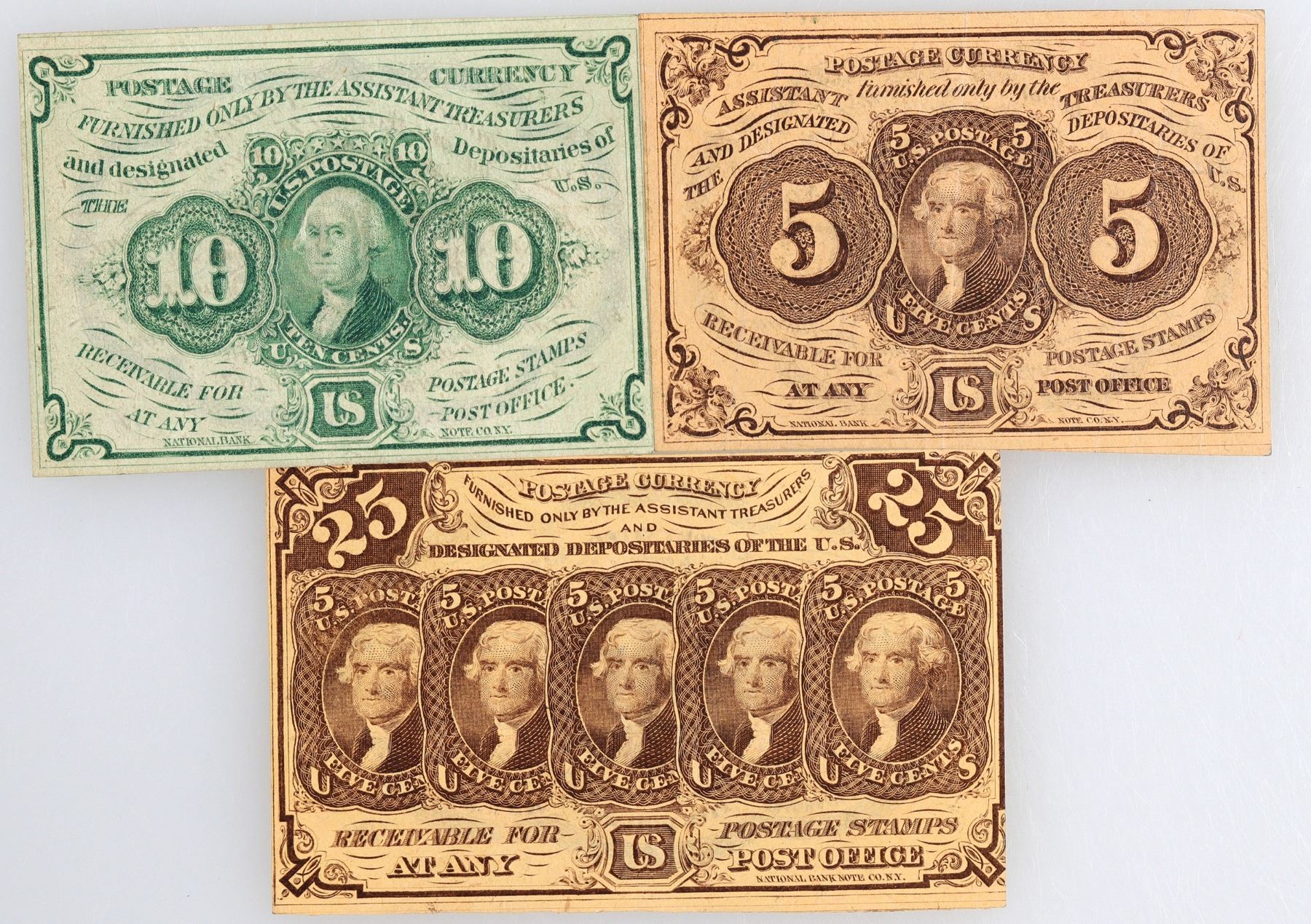 Three different pieces: 1) Fr#1242, 10c First Issue, CU; 2) Fr#1230, 5c First Issue, AU; 3) Fr#1281, 25c First Issue.