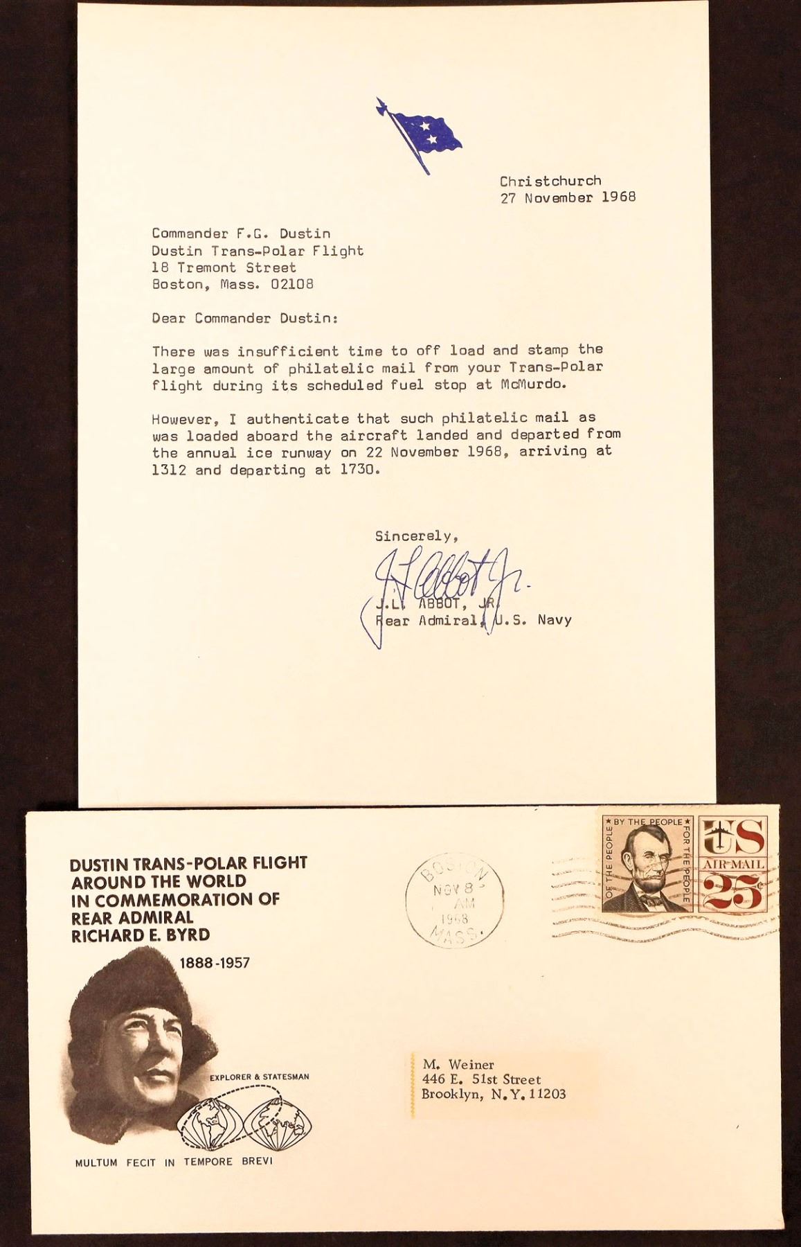 Philatelic cover and letter signed and sent by Rear Admiral J.L. Abbot, commemorating Dustin Trans Polar Flight Around the World in commemoration of Admiral Byrd.