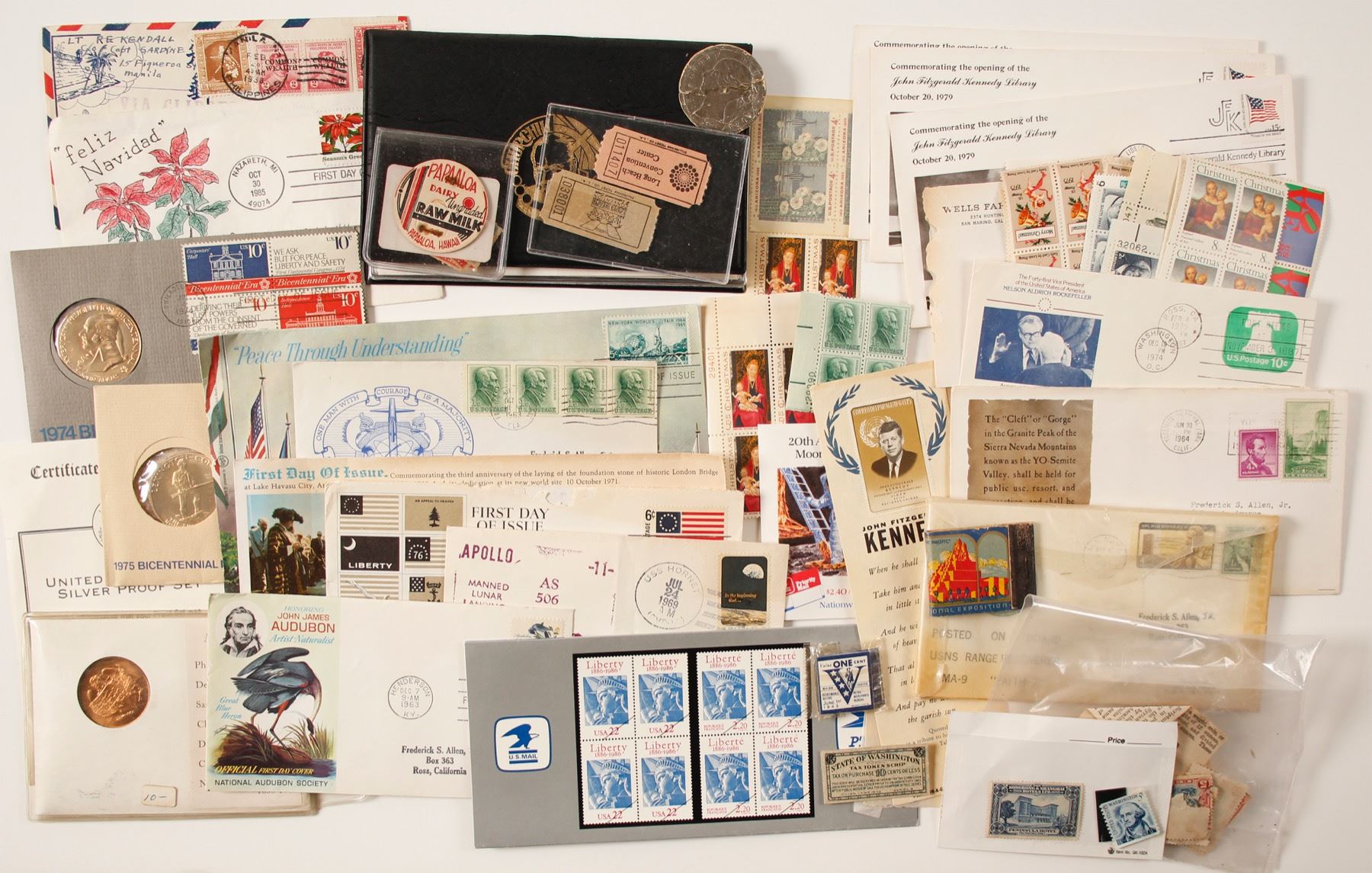 Large lot of first day covers, plate blocks and one piece of 25 cent fractional currency. State: City: Date: HWAC# 84748