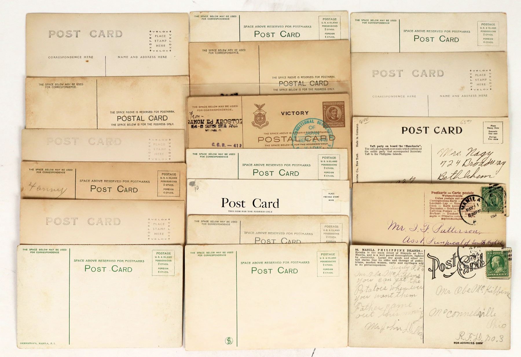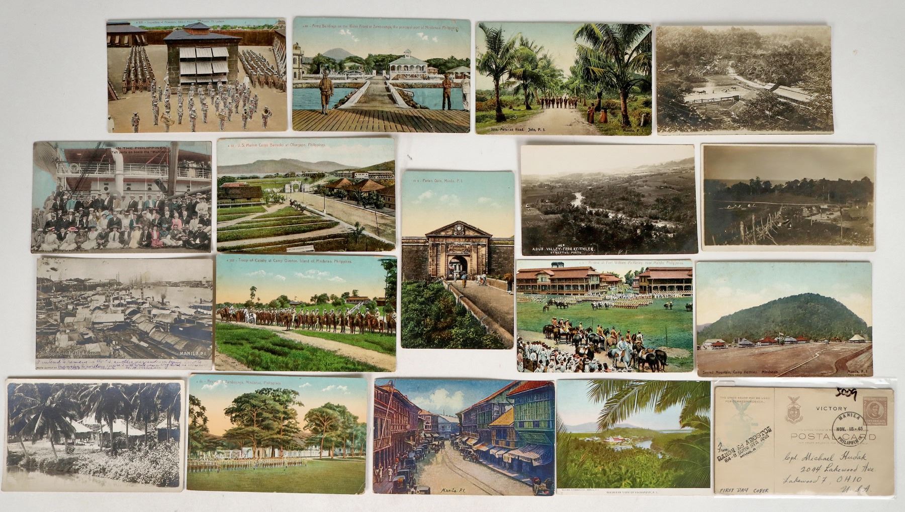 17 Philippines postcards with 4 RPC's. Manila, Agus Valley, Jolo, Inspection of Prisoners at Bilibid Prison, Camp Overton etc.[ Philippines