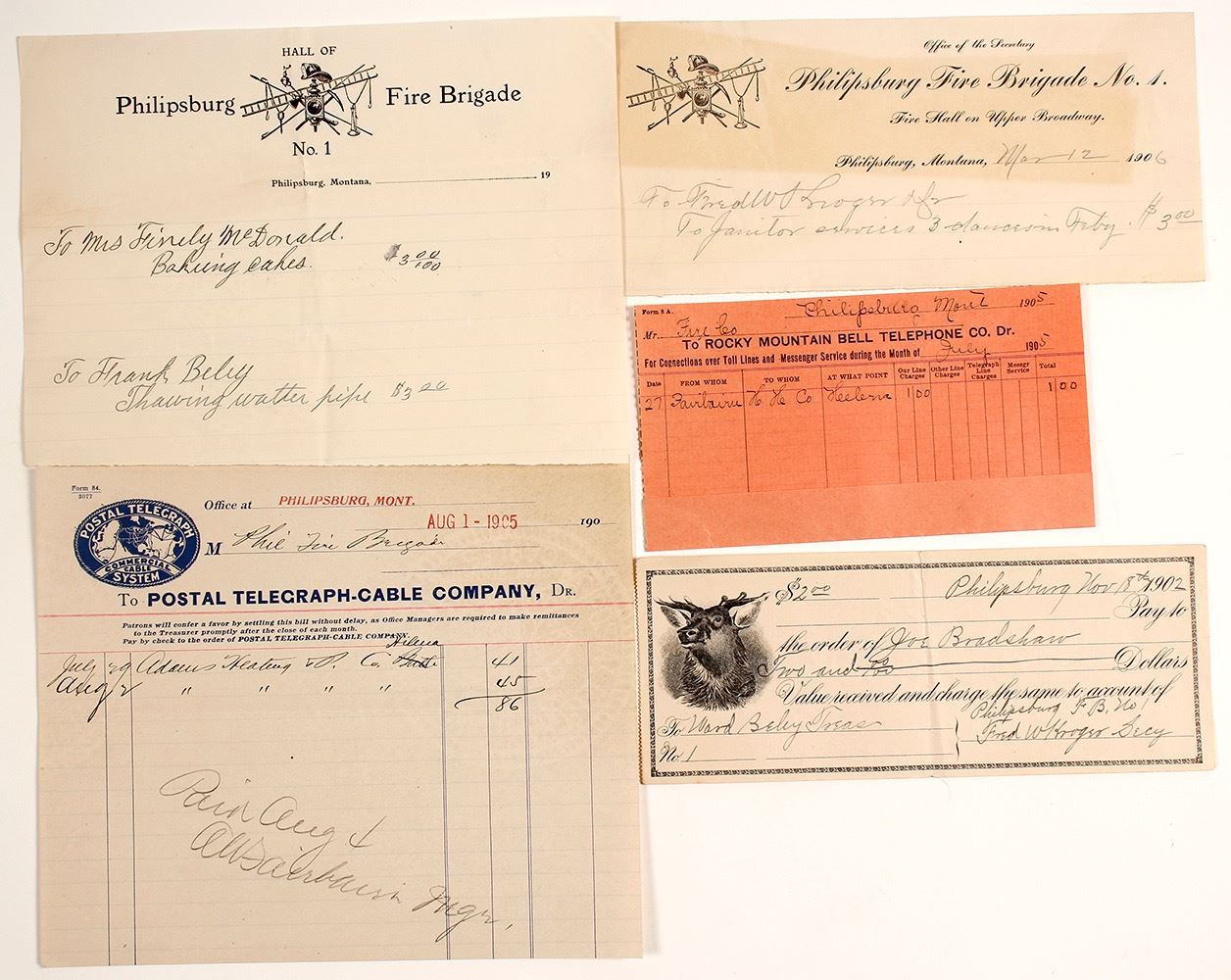 Lot of 5. Includes: two pictorial receipts for the Philipsburg Fire Brigade No. 1, 1906; a 1902 pictorial draft for the same fire company; a 1905 Postal-Telegraph-Cable Company billhead to the Philipsburg Fire Brigade; and a 1905 receipt from the Rocky Mountain Bell Telephone Co. to the fire company. HWAC# 60050 Date: 1902-1906 Location: Philipsburg, Montana