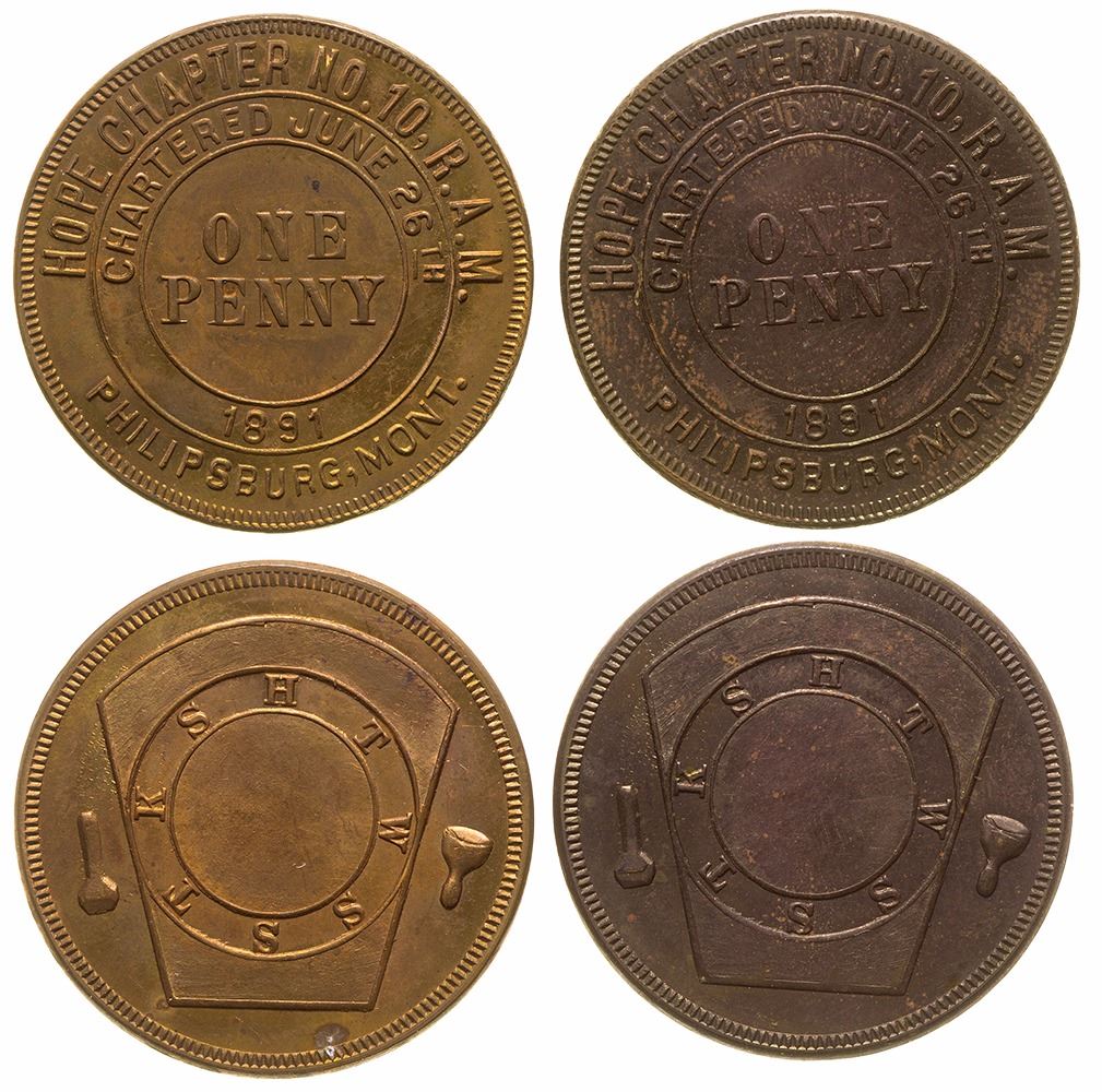 Two tokens, Fraternal Order R. A. M. Hope Chapter No. 10. State: Montana City: Phillipsburg Date: FHWAC#: 41626