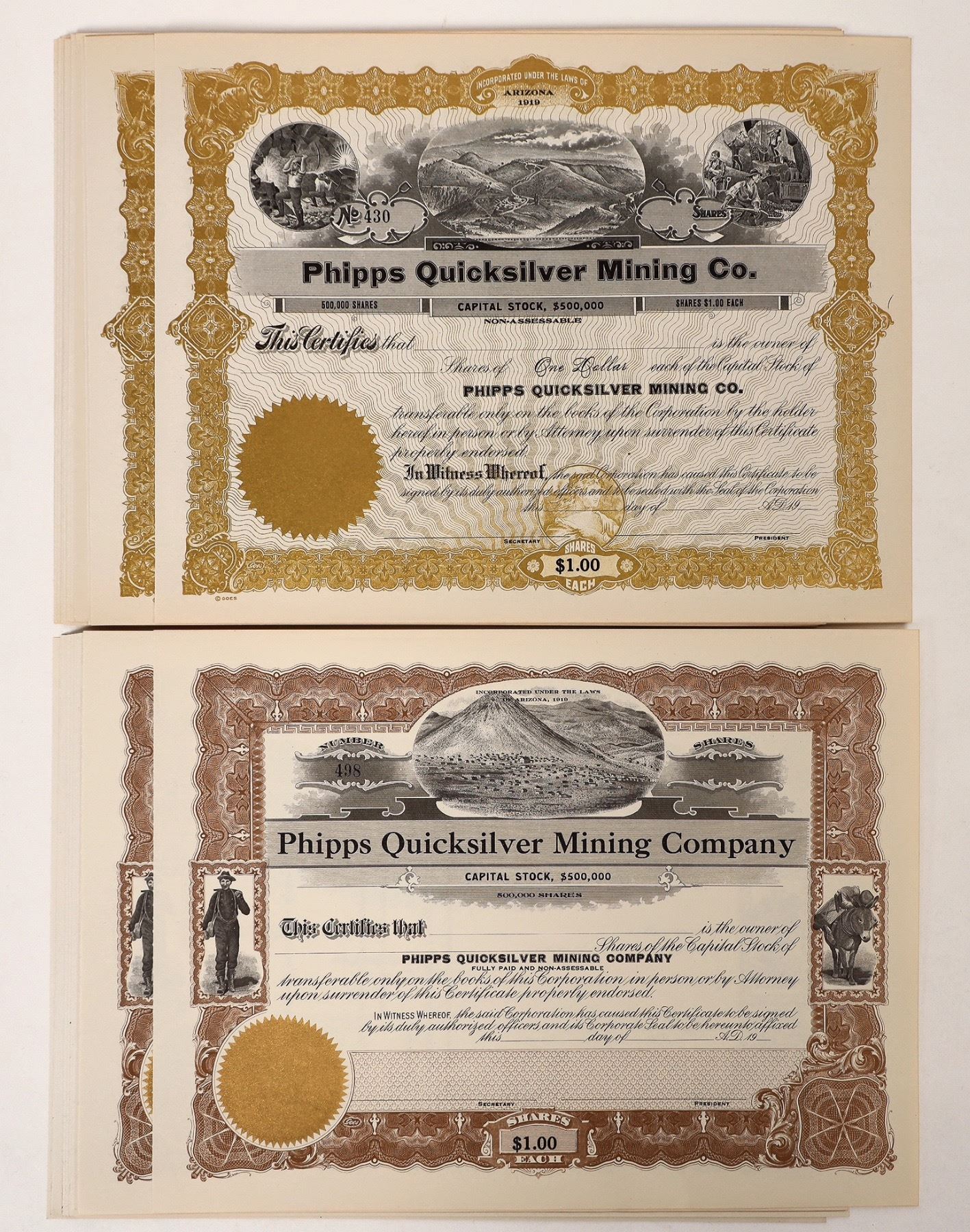 Unissued mining stock certificates (30) from the Phipps Quicksilver Mining Company. When issued, they sold for $1 per share. mercury mining was quite prevalent in San Benito and the Almaden region in Santa Clara County. These are unused and in near new condition. Please see photos for more details.