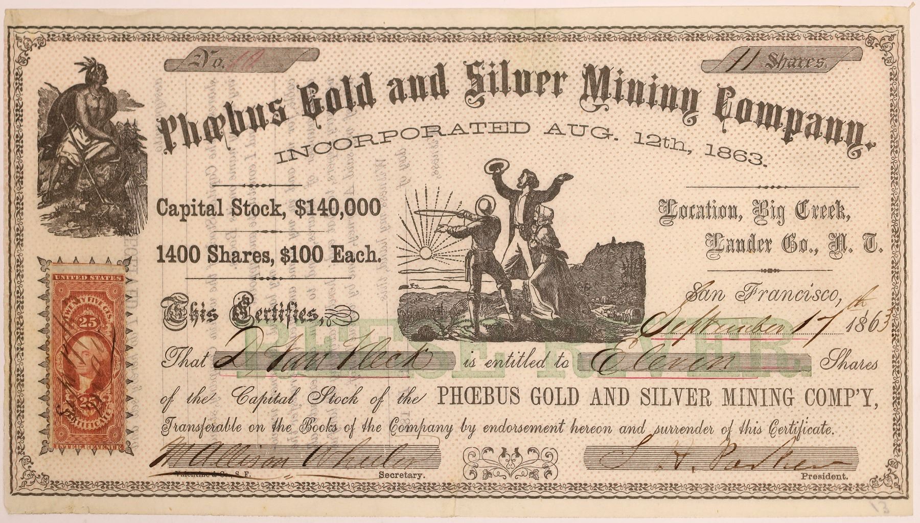 Early number 10 for 11 shares to Durbin Van Vleck. Datelined San Francisco 1863. Signed by M Allison Wheeler and president SH Parker. Incorporated Aug. 12, 1863. Location at Big Creek, Lander Co. N. T. 'Reese River' in green underprint. Two vignettes: pioneers finding the promised land and a contemplative Native American. Valentine & Co. printer. 25c Certificate Revenue stamp. Dog ears and a rip top center that has been taped on back. Looks like museum quality tape as it has not bled through. Company named for the God of Light. On December 10, 1863 a newspaper article named it one of the best mines in Big Creek. Big Creek district was just outside Reese River district and eventually became part of that district. Durbin Van Vleck was a celebrated San Francisco wood block carver and had a hand in several Nevada stocks. M Allison Wheeler was a San Francisco specialist in Reese River stocks. He would move to Cerro Gordo where his assets were said to be quite valuable when he passed away in 1908. Historical notes on Van Vleck, Wheeler, Big Creek Mining District, and the mine included. State:Nevada City:Big Creek, Lander Co. Date:1863 Provenance: Joe Elcano Nevada Mining Stock Collection