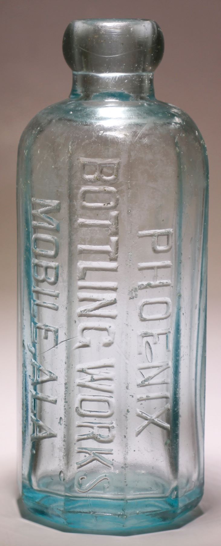 Phoenix/ Bottling / Works / Mobile Ala. // Aqua, Hutchinson style soda, 6 1/2' tall, tooled top, 10 panels. Fairly good condition, with general body and rib wear. Slight, cloudiness in the upper front shoulder area. No major chips, cracks or dings. ( RH). State: Alabama City: Mobile Date: 1890's-1900's. HWAC# 76000