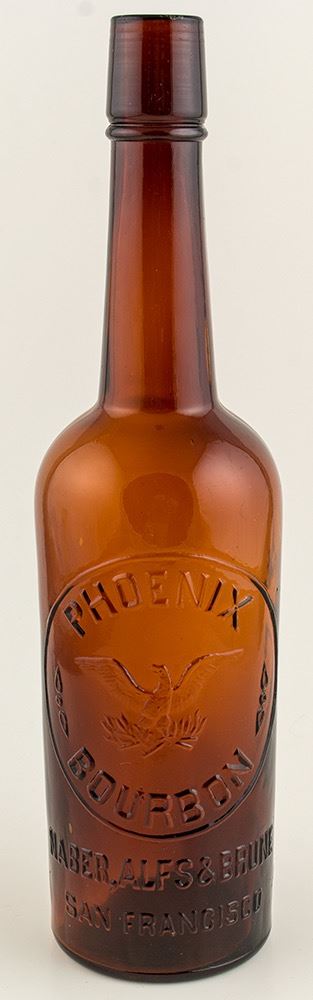 Phoenix Bourbon, Naber, Alfs & Brune, San Francisco with image of the "Phoenix Rising" in center. Medium to dark amber, bright luster, choice bold embossing. 284 on the bottom. A choice example. Thomas number 123. Tooled top, circa 1890’s. A premium example of one of the most popular “picture” whiskies. City: San Francisco State: California Inventory Number: 38925