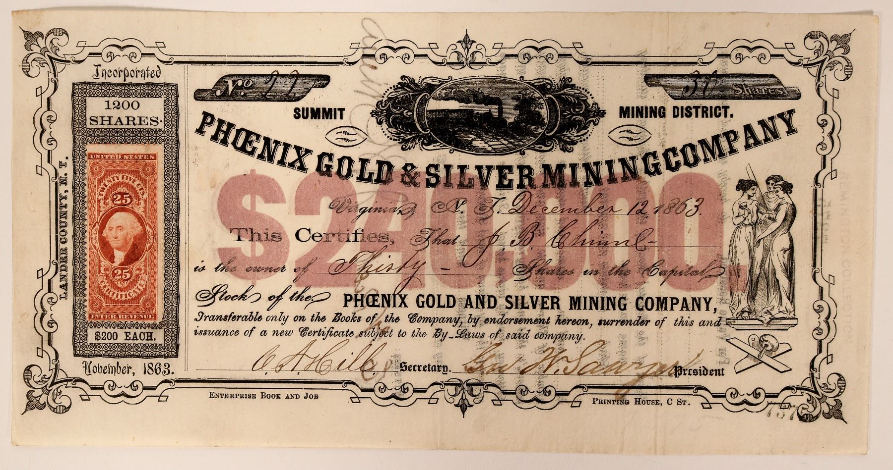 # 22 for 30 shares to JB Chime(?). Signed by CA Hill and president GW Sawyer. Hill was an attorney in the firm of Hill & Pedegast, Fulton Market building. Dateline Virginia N. T. 1864. Incorporated November 1863. Not cancelled. 25c Certificate revenue stamp. Location: Summit Mining District, Lander County, N. T. Steam train vignette. Underprint pink '$240,000.' Printer: Enterprise Book and Job, Printing House, C St. This would be the same time period Samuel Clemens was working at the Enterprise. Excellent condition.No edge, corner, pin hole or discoloration issues. Slightest staining upper left. The Summit district was organized at the foot of Bunker Hill on Kingston Creek (Smoky River or Smoky Creek) sometime prior to 1866. The district is sometimes divided into the Santa Fe district, on the north, and the Bunker Hill district, on the south. Ken Prag Collection