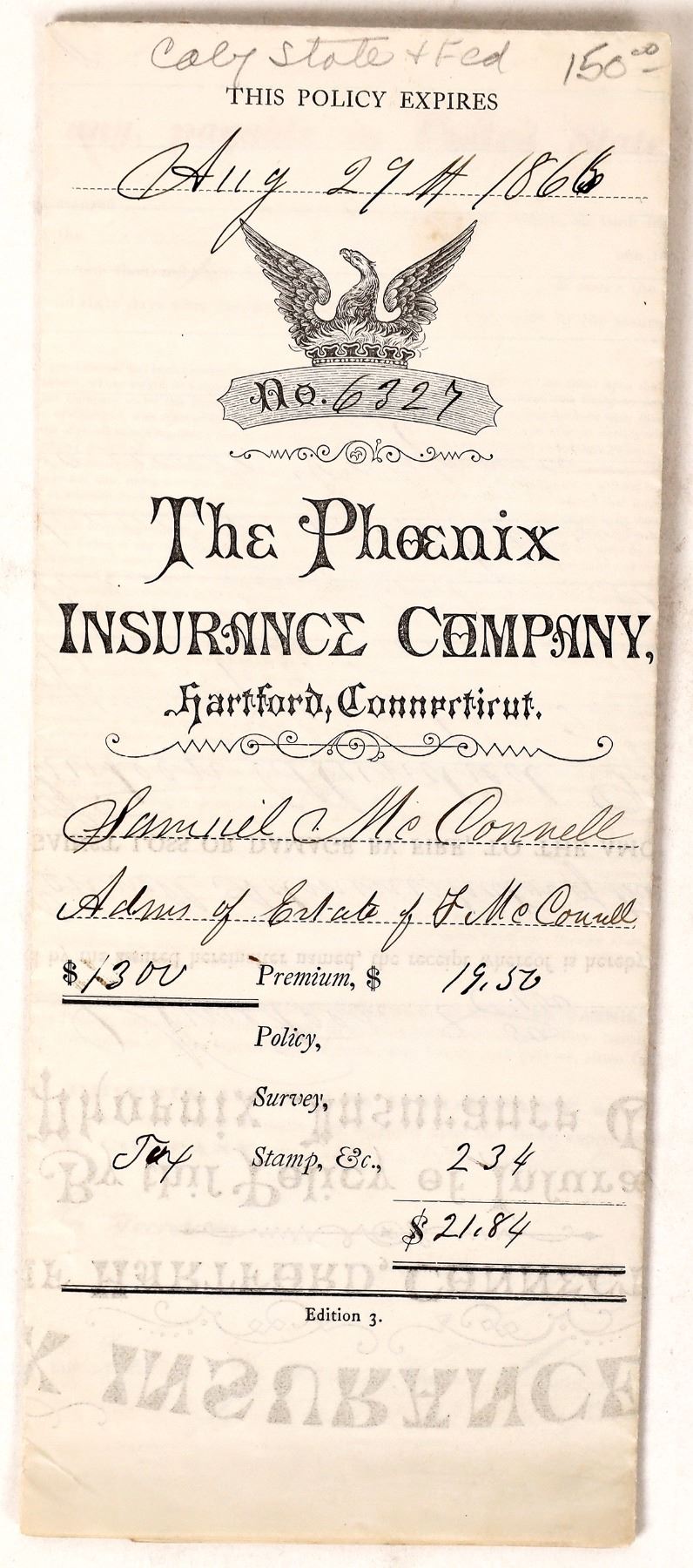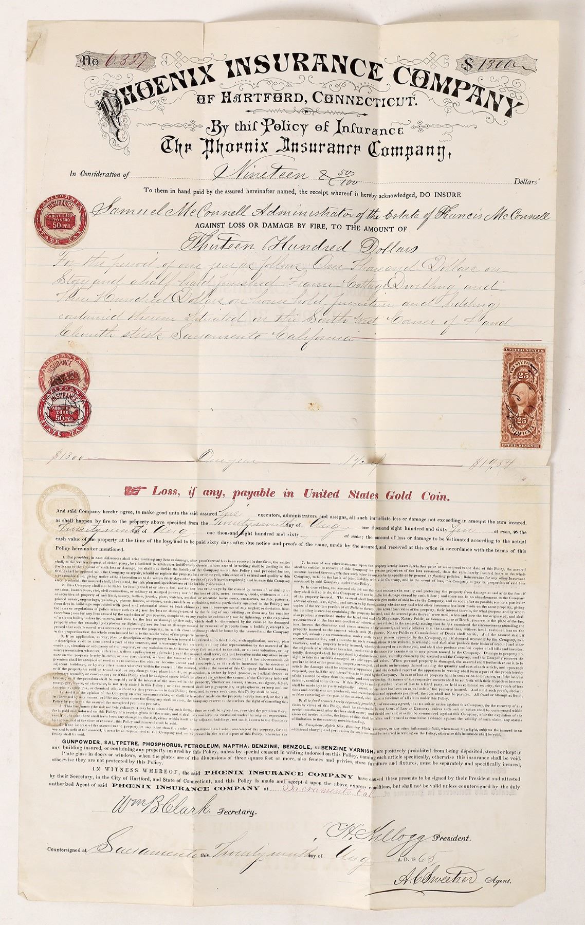 Elaborate insurance policy issued by The Phoenix Insurance Company of Hartford, Connecticut with three California revenue stamps and one U. S. 25 cent revenue stamp. California